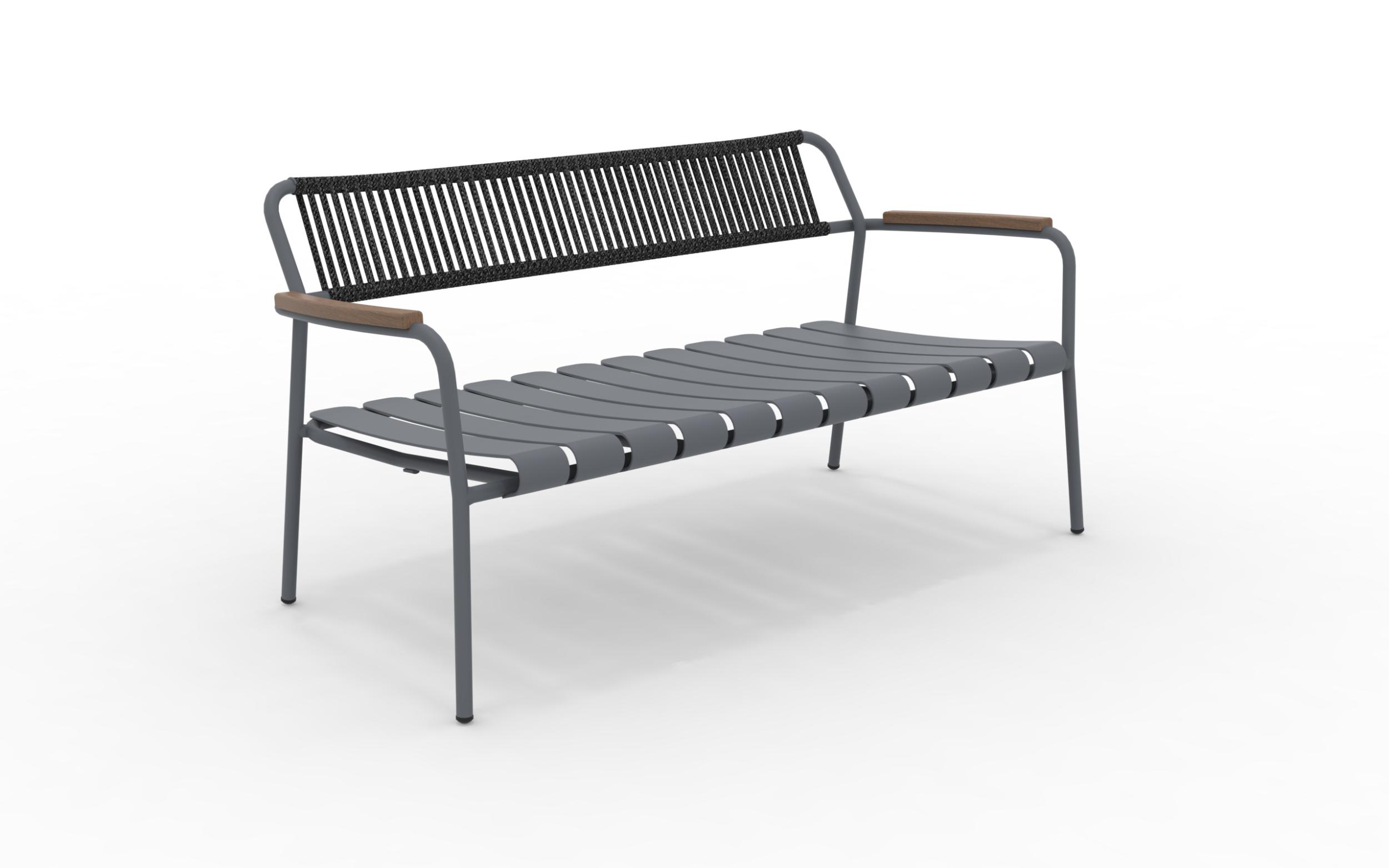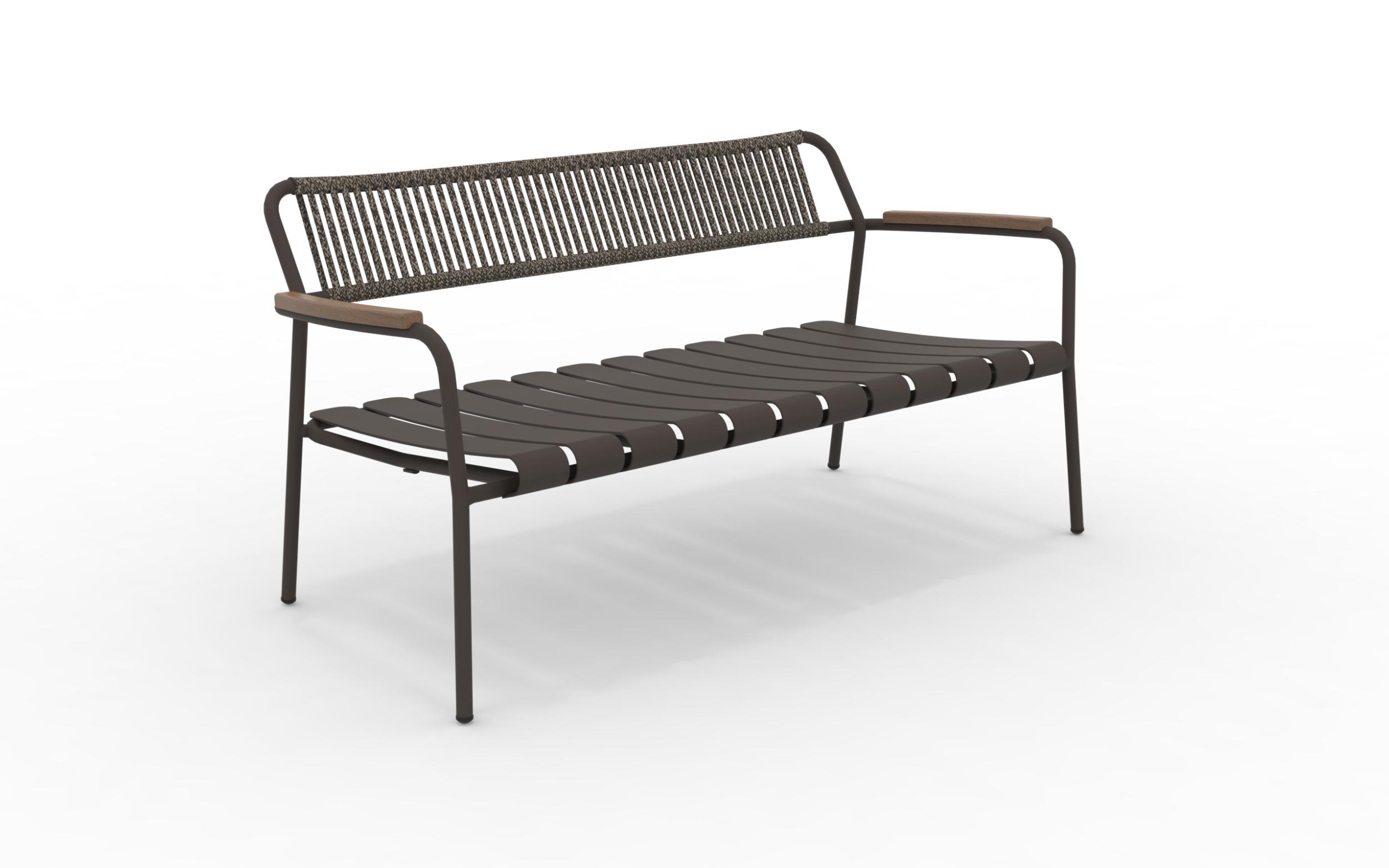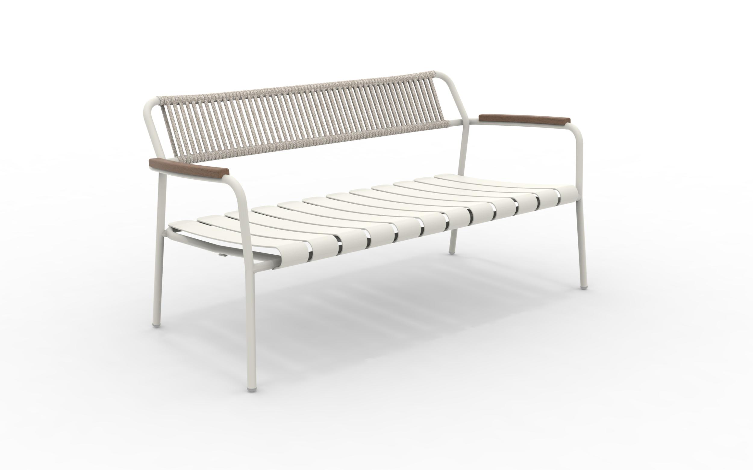 The Verdea Rope sofa in aluminum, rope and FSC teak wood applied to the arms, is a piece of furniture suitable for any garden or outdoor living room. Stackable sofa