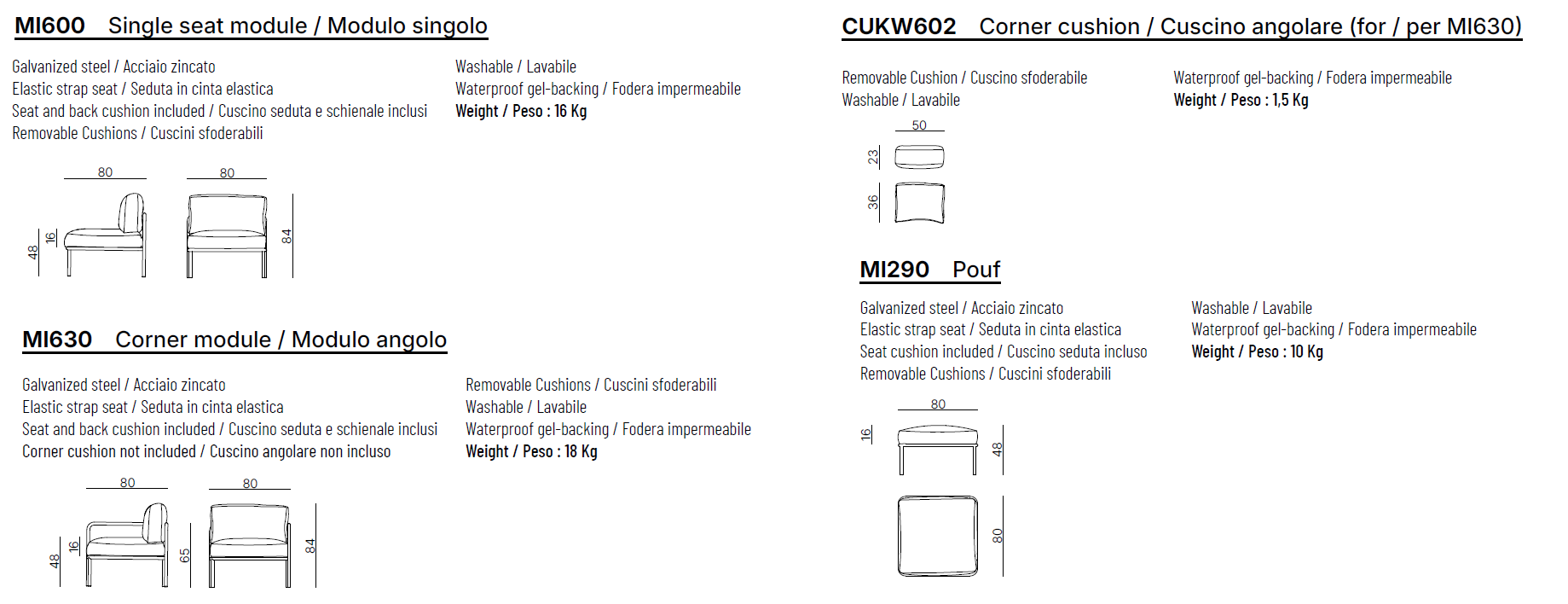 MI630 CORNER MODULE cm: L. 80 x D. 80 x H. 84 x HS. 48 x HB. 65