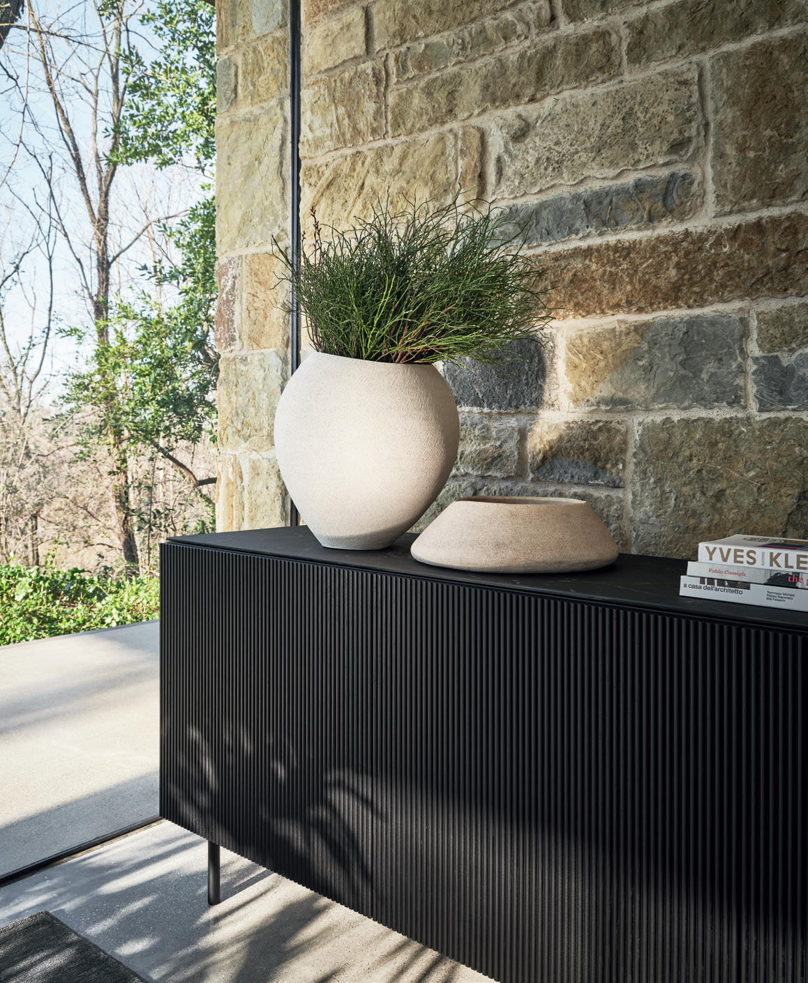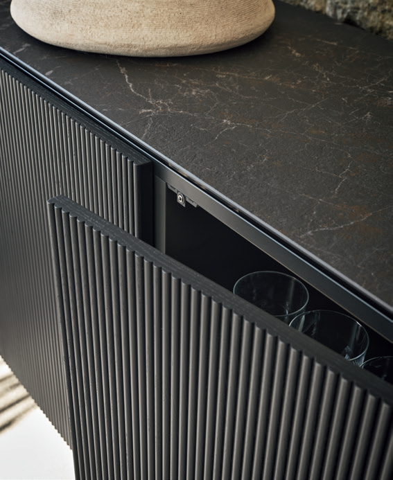 The Vertical door features a reinterpreted ribbed pattern in two finishes. The classic and elegant glass reinterprets the traditional sideboard with a contemporary twist. The warm and sophisticated wood elevates the material, bringing a new tactile dimension to the living room.