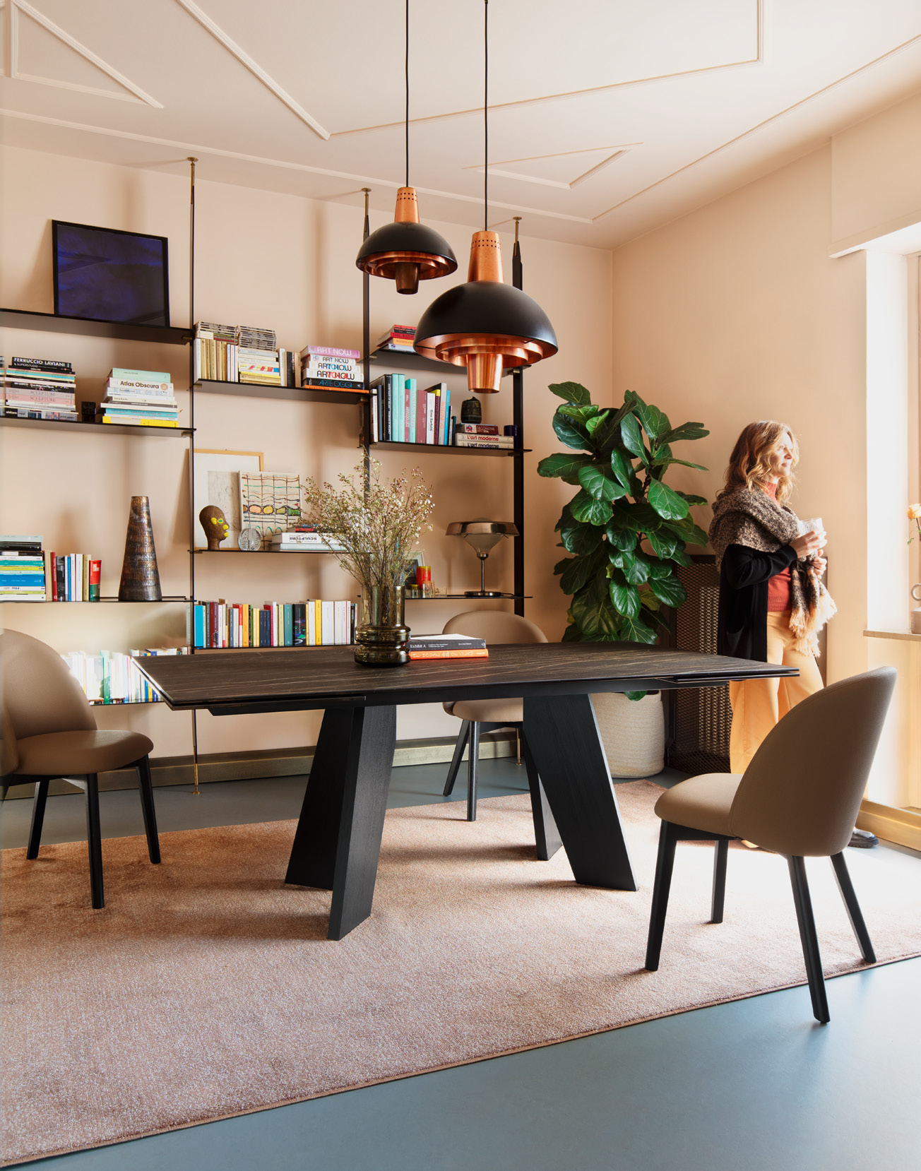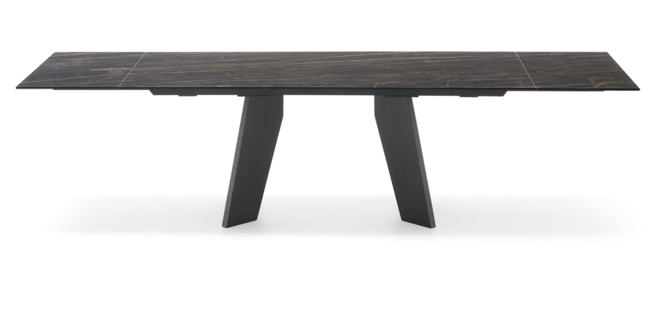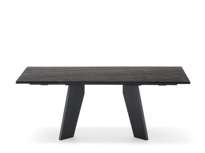 The Victor table stands out for its base featuring two trestles in stained ash wood, which create a distinctive graphic sign and give dynamism and visual momentum to the entire design. The refined and resistant ceramic top integrates harmoniously with the base, enhancing the contrast between the materials. The balance between solidity and lightness makes this table an element of great aesthetic impact, capable of enriching any environment with its elegance.