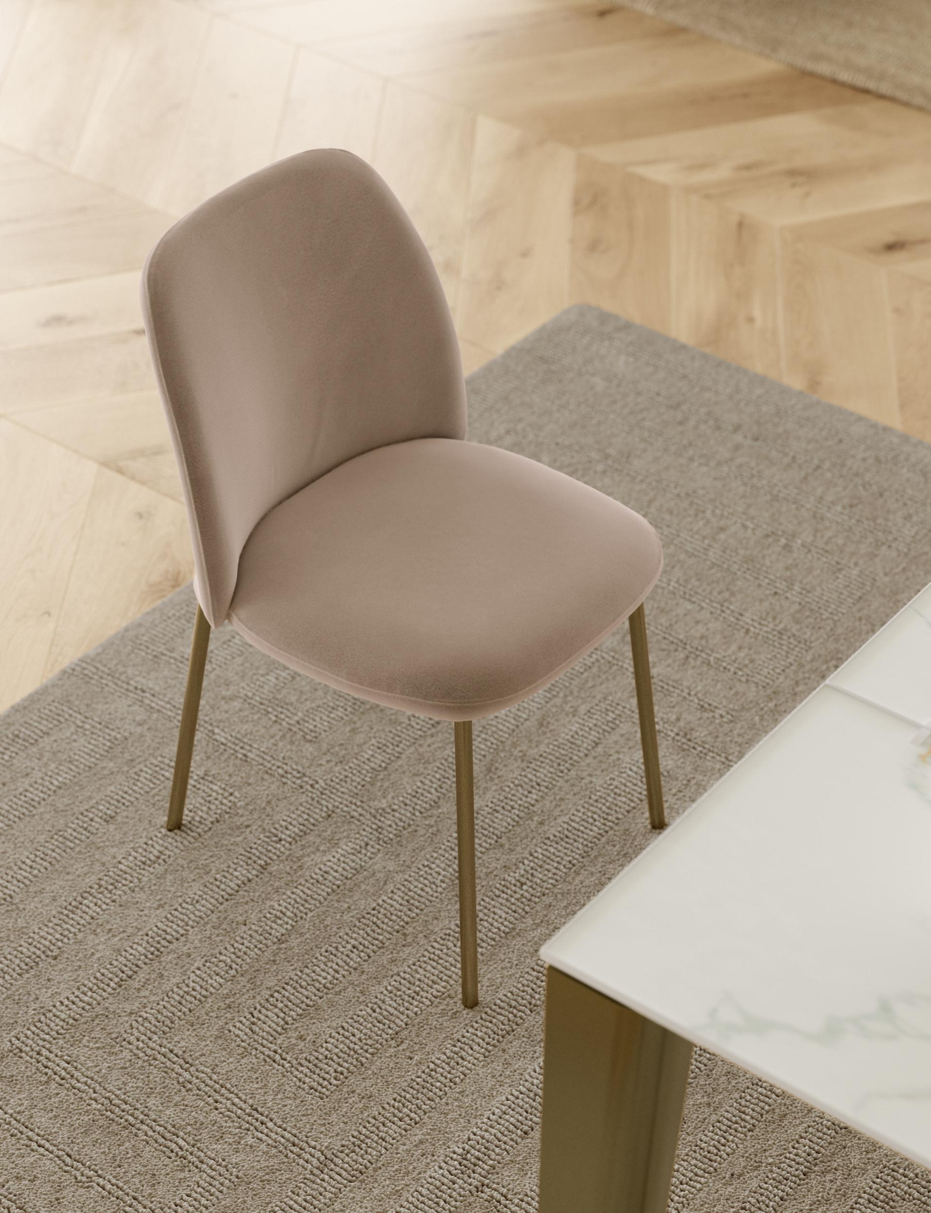 Chair with lacquered steel frame, padded and upholstered in numerous finishes and colors. Available without armrests or with armrests.