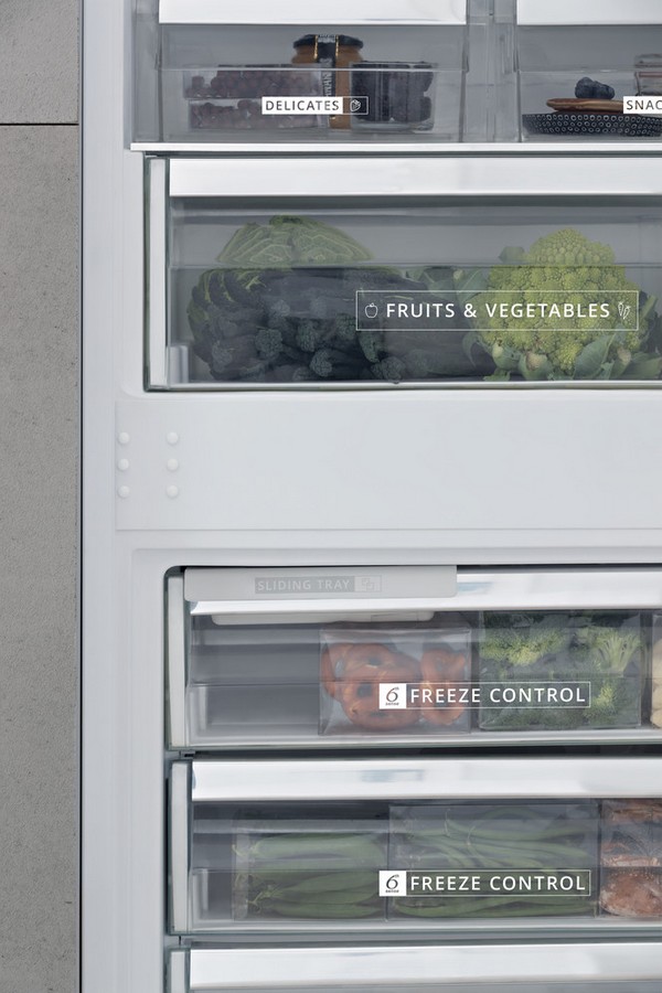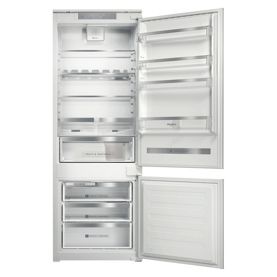 Whirlpool SP 40 801 built-in combined refrigerator with freezer with particular characteristics: white colour. Tall and spacious model, suitable for the needs of the whole family. Glass shelves, robust and elegant at the same time. Regular and uniform air flow inside the appliance, for enhanced ventilation. Exclusive 6TH SENSE FreshControl technology, which automatically regulates temperature and humidity levels, ensuring long-lasting freshness.