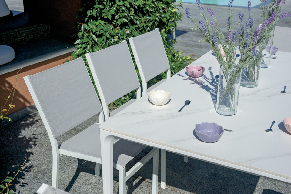 The 180x90 Alghero table combines refined aesthetics and high-quality materials, making it an ideal choice for stylishly furnishing outdoor spaces. The white aluminum frame ensures lightness, stability, and weather resistance, maintaining its elegant appearance over time.
