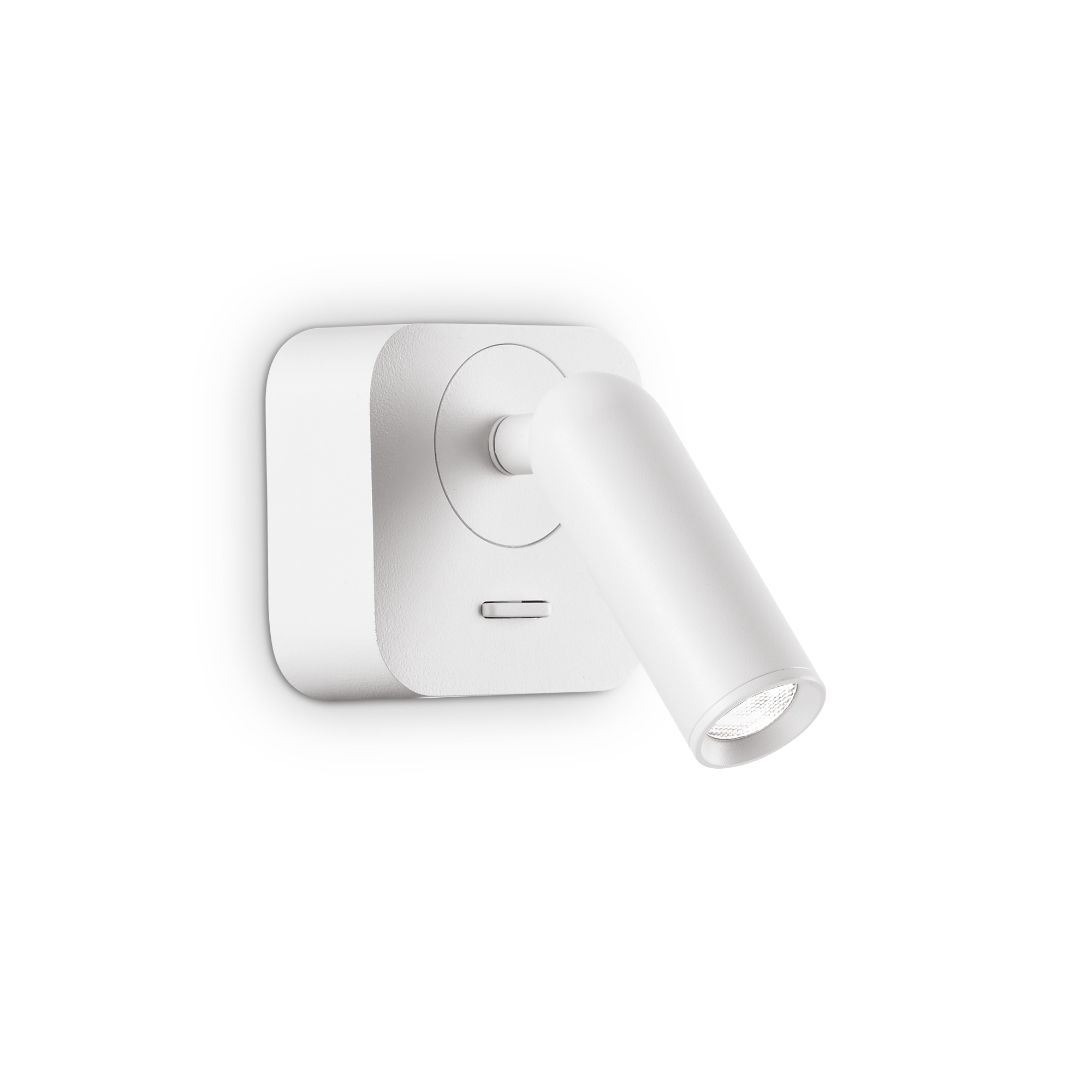 White BEAN SQUARE AP wall light by Ideal Lux with base and adjustable diffuser in powder-coated metal. White color with black switch and joint. Lamp with integrated switch. 3000K LED light source included.