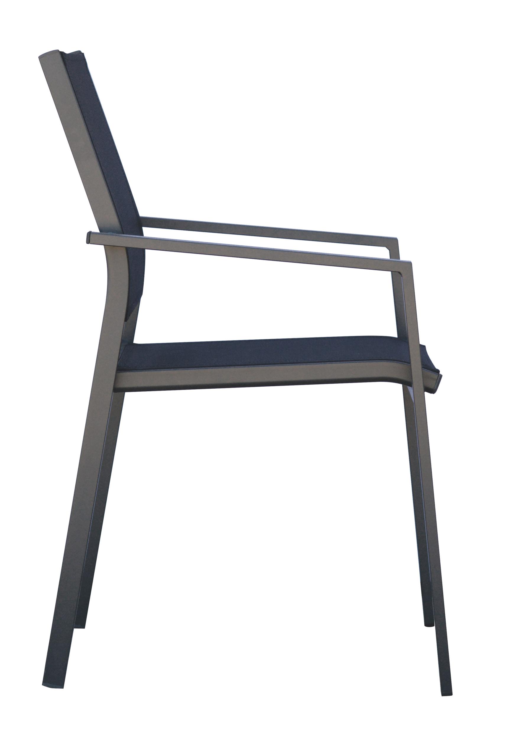 ANTHRACITE aluminium and BLACK textilene, with armrests, stackable.