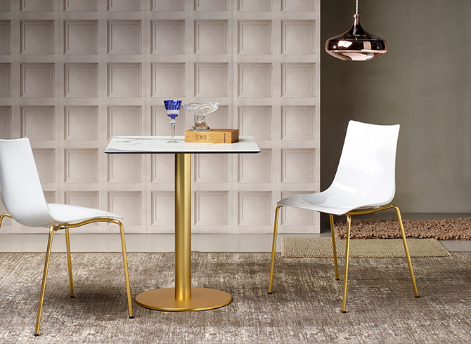 4-legged frame in chromed steel tube or with satin brass effect finish