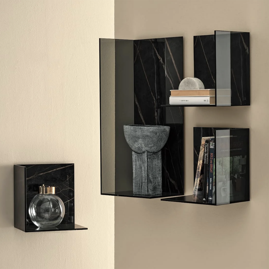 Zen shelf by Bontempi, positionable vertically or horizontally, composed of 3 elements: back in SuperMarble, side and shelf in Smoked Glass.
