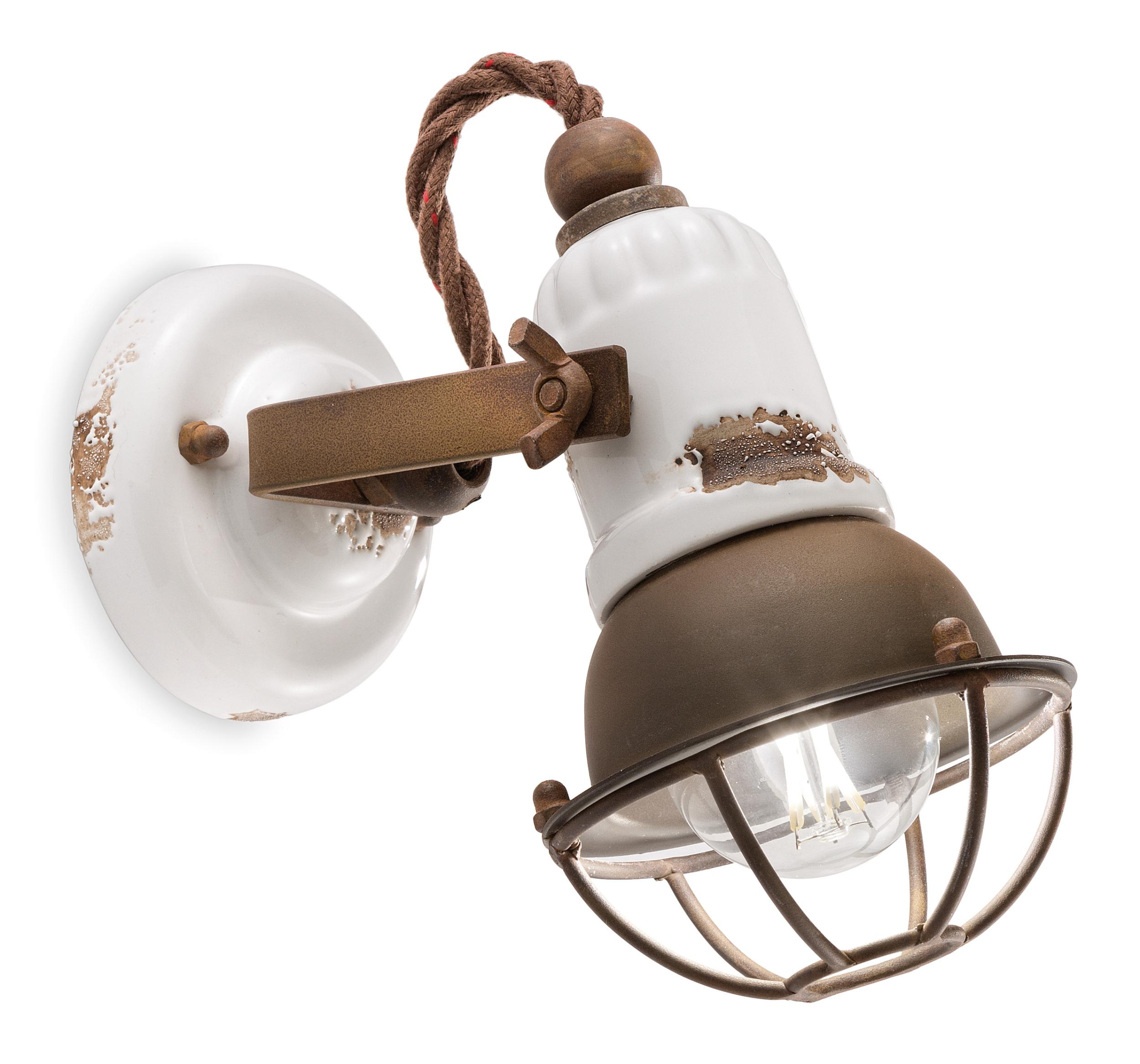 Applique 1 lumière avec cage Retrò Loft C1675/1 par Ferroluce avec matériau principal : céramique, parties métalliques en fer corten vieilli et câble en coton recouvert.