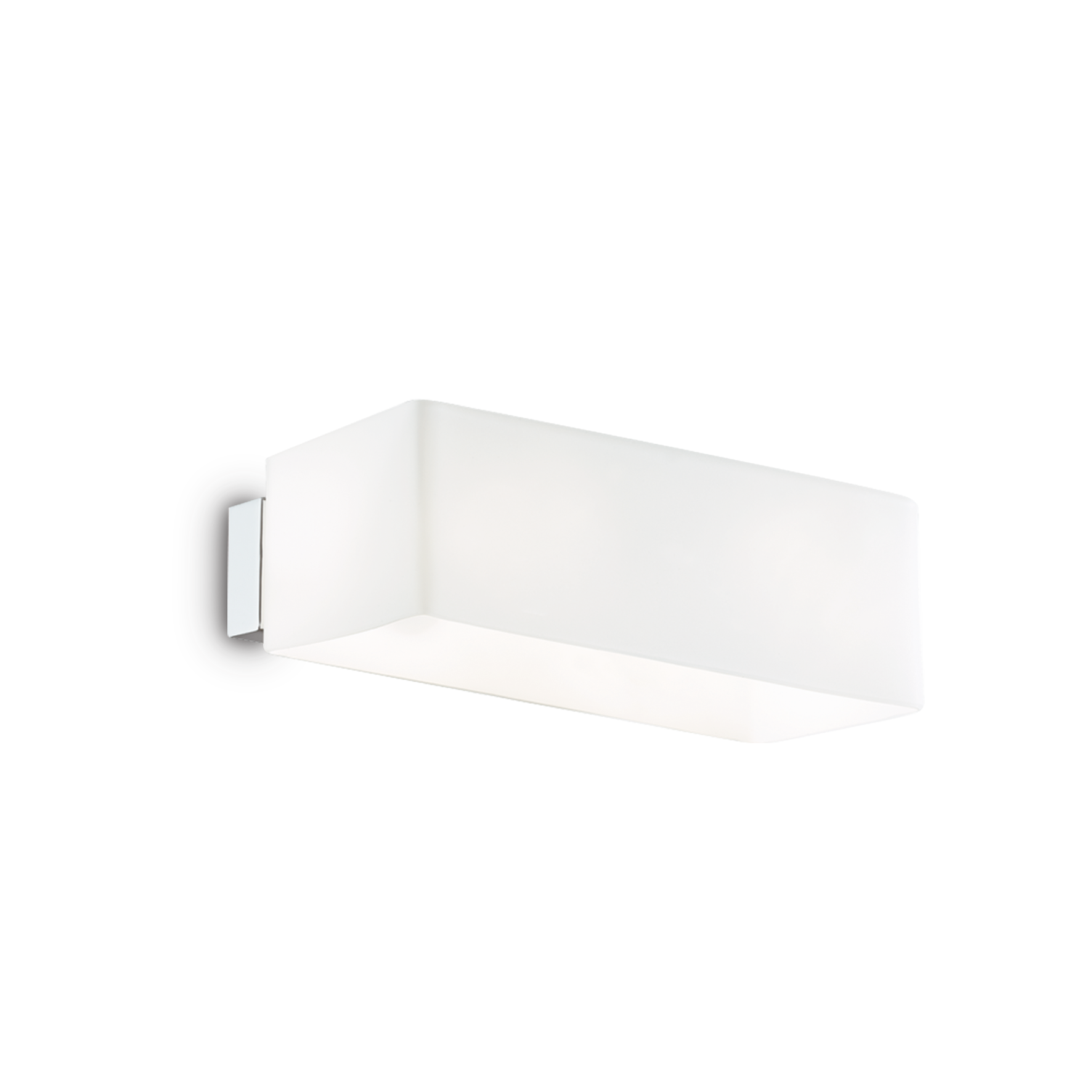 Applique murale blanche BOX AP2 par Ideal Lux avec structure en métal chromé. Diffuseur en verre soufflé, stratifié et gravé. Blanc à l'intérieur et coloré à l'extérieur. Ampoules incluses.