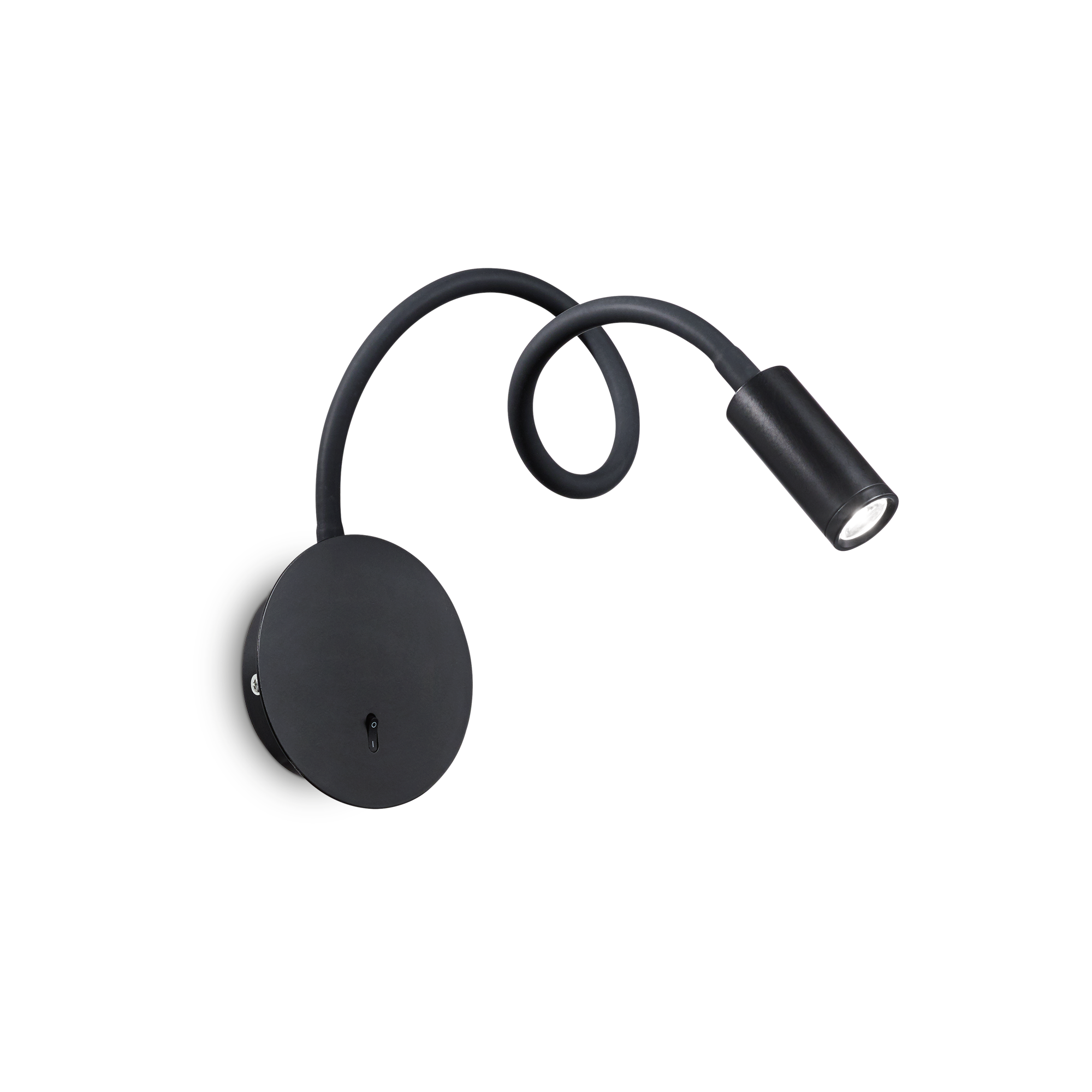 Corps en métal avec bras flexible réglable recouvert de caoutchouc. Finition noir mat. Source lumineuse LED 3000 K, durée de vie de 20 000 heures. Interrupteur intégré.