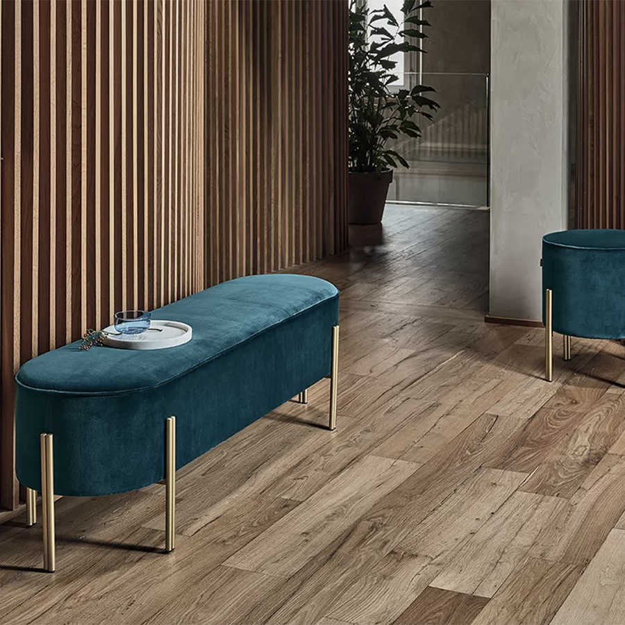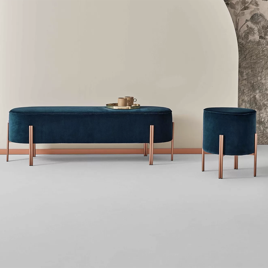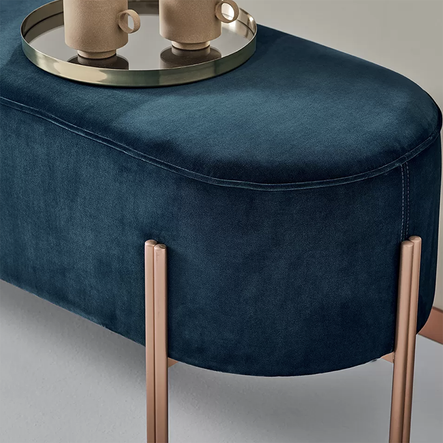 Banc Puffoso de Bontempi avec structure en acier et assise rembourrée recouverte de nombreux matériaux et finitions.
