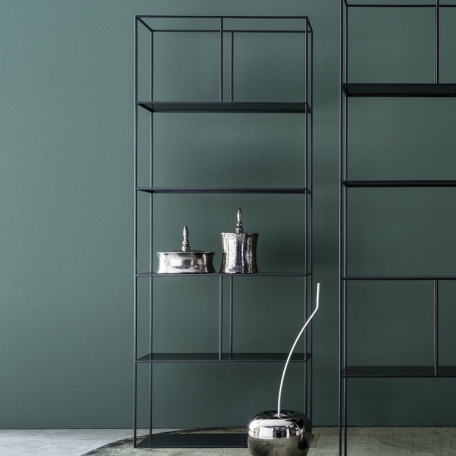 Bibliothèque 80 et 120 en métal épaisseur 10 mm avec étagères intégrées montées sans système de fixation apparent. Peinture époxy anthracite. La bibliothèque 80 et 120 est un meuble raffiné, caractérisé par un design essentiel et des lignes modernes.