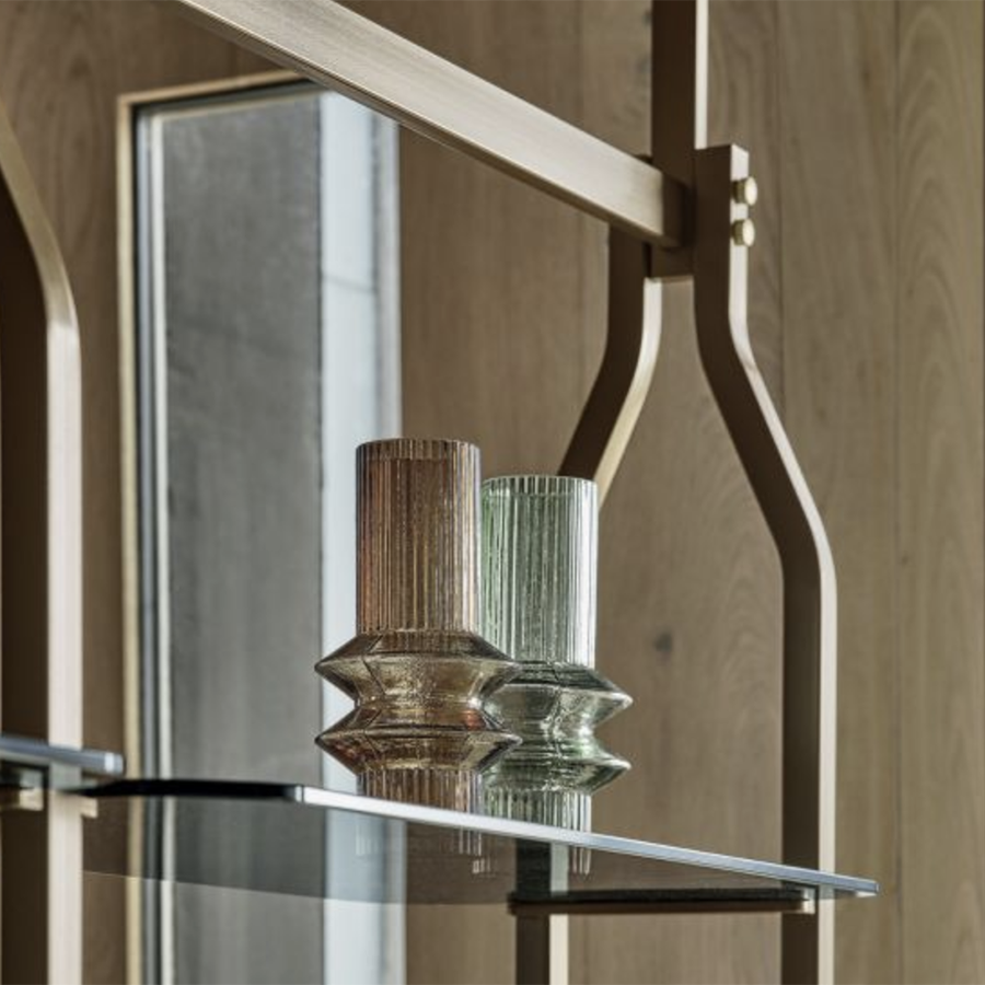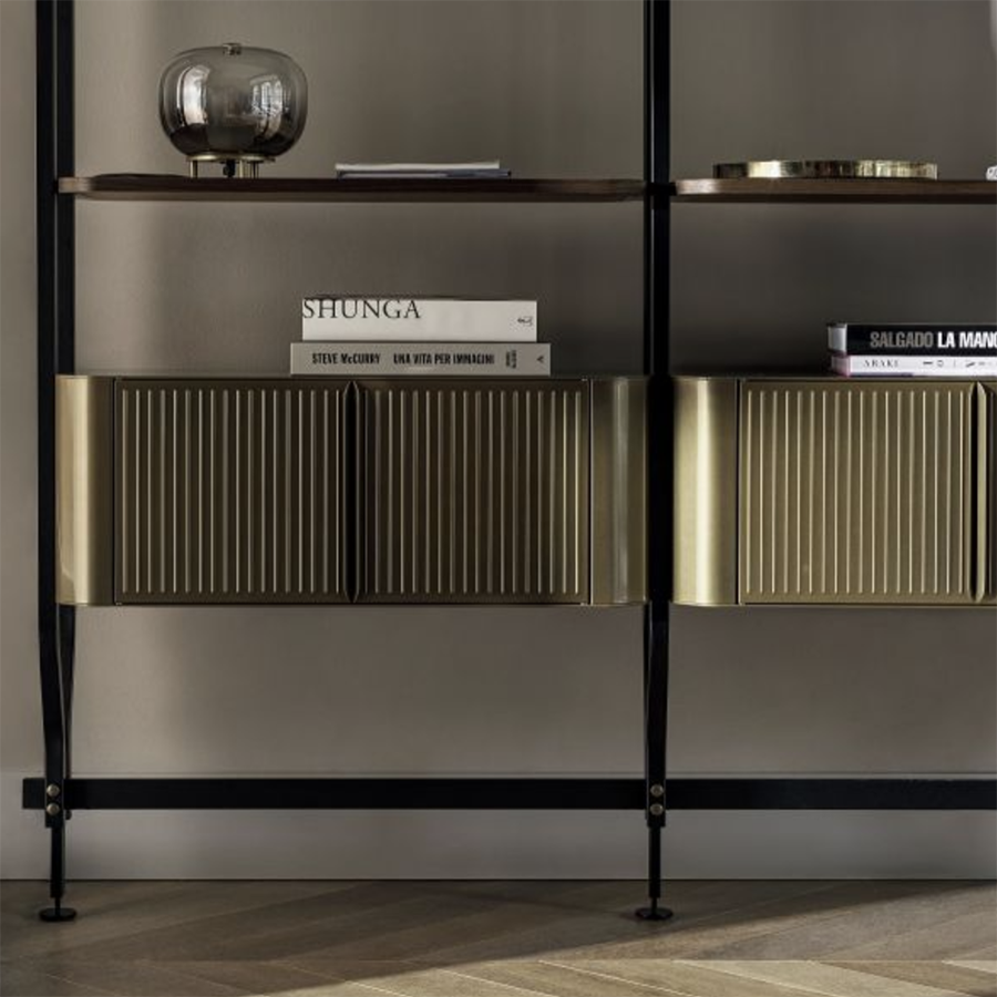 Bibliothèque et module supplémentaire avec fixation au plafond ou au mur conçu pour l'insertion de maximum 4/8/12/16/20 étagères et/ou conteneurs en option. Structure, traverses et détails décoratifs en acier laqué.