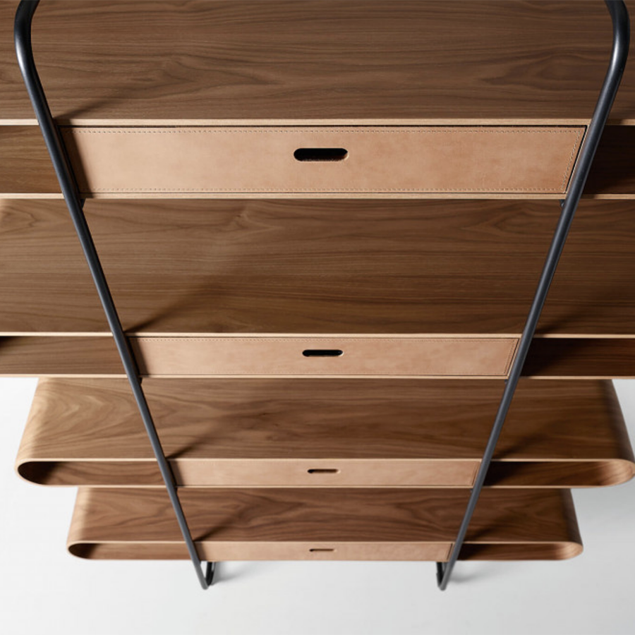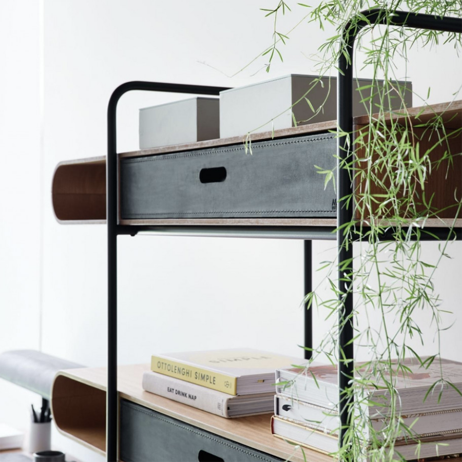 Bibliothèque murale Apelle avec structure en métal et étagères en bois. En option : tiroirs en cuir.
