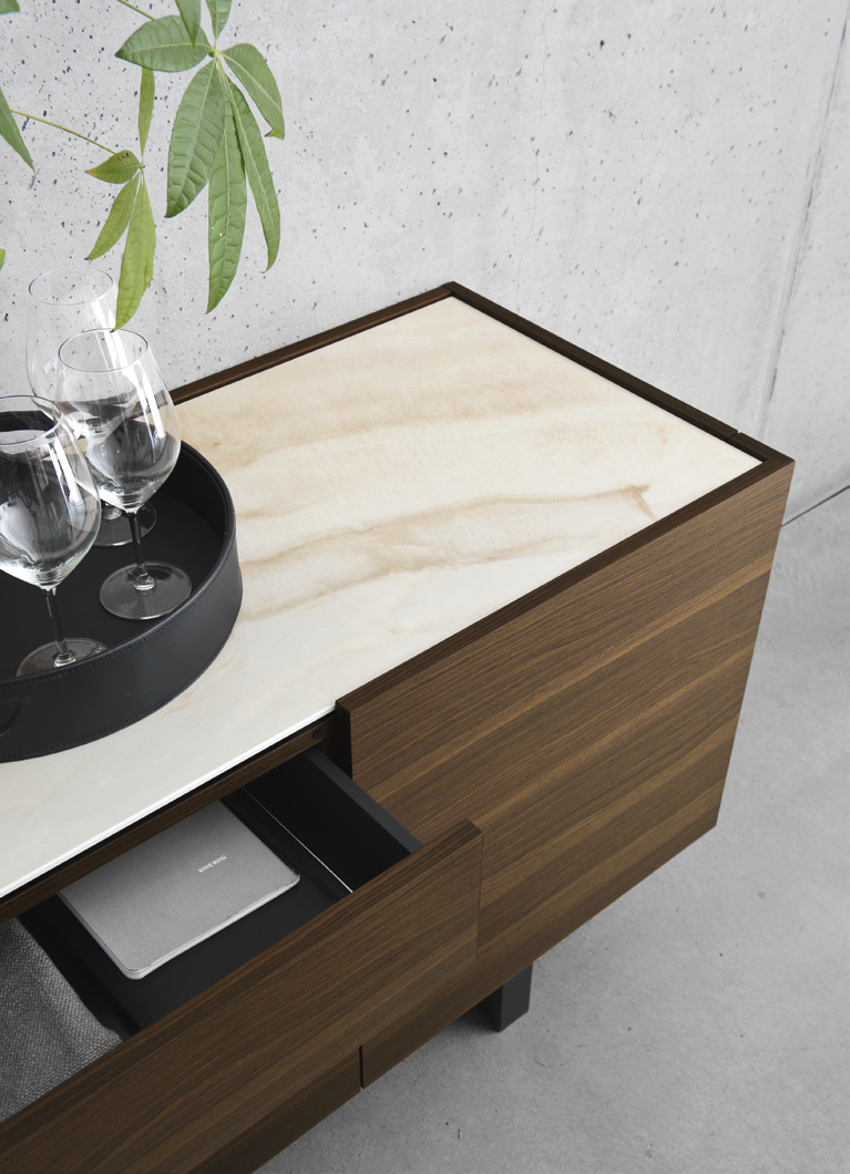HORIZON est une gamme de meubles de rangement disponibles en plusieurs configurations. Fabriqués en bois, ils sont dotés de portes centrales avec ou sans tiroirs. L'accès aux compartiments centraux se fait par une porte coulissante.
