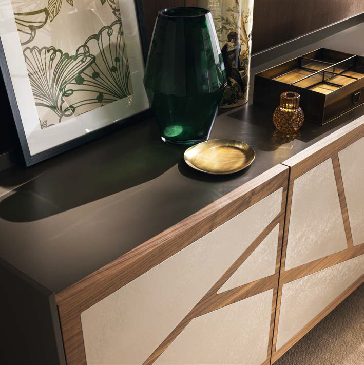 Buffet Sakura d'Altacorte 3 portes battantes avec 3 étagères internes en bois. Le buffet Sakura est disponible dans de nombreuses finitions avec possibilité de personnalisation maximale des portes grâce au choix des finitions, entre acier ou texture, des inserts géométriques qui les composent, il est également possible de choisir la base du buffet Sakura, disponible en trois versions, il est également disponible dans de nombreuses finitions. Les lignes du buffet Sakura s'inspirent de la culture japonaise et notamment du cerisier. Les motifs géométriques décomposés apportent une touche de raffinement raffiné.