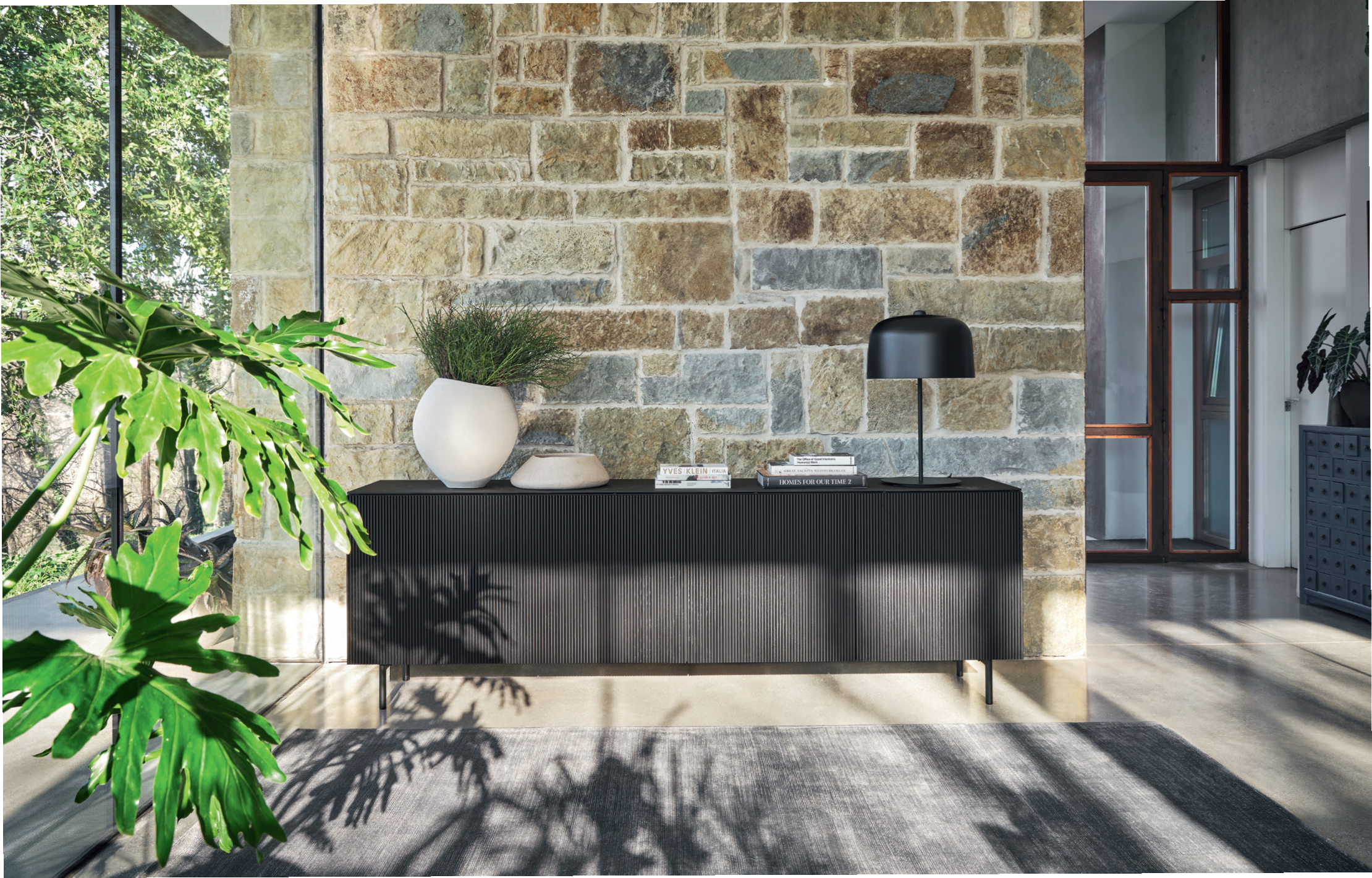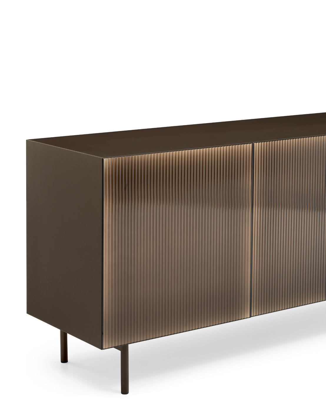 La porte Vertical présente un motif nervuré réinterprété en deux finitions. Le verre classique et élégant revisite le buffet traditionnel avec une touche contemporaine. Le bois chaleureux et sophistiqué sublime le matériau, apportant une nouvelle dimension tactile au salon.