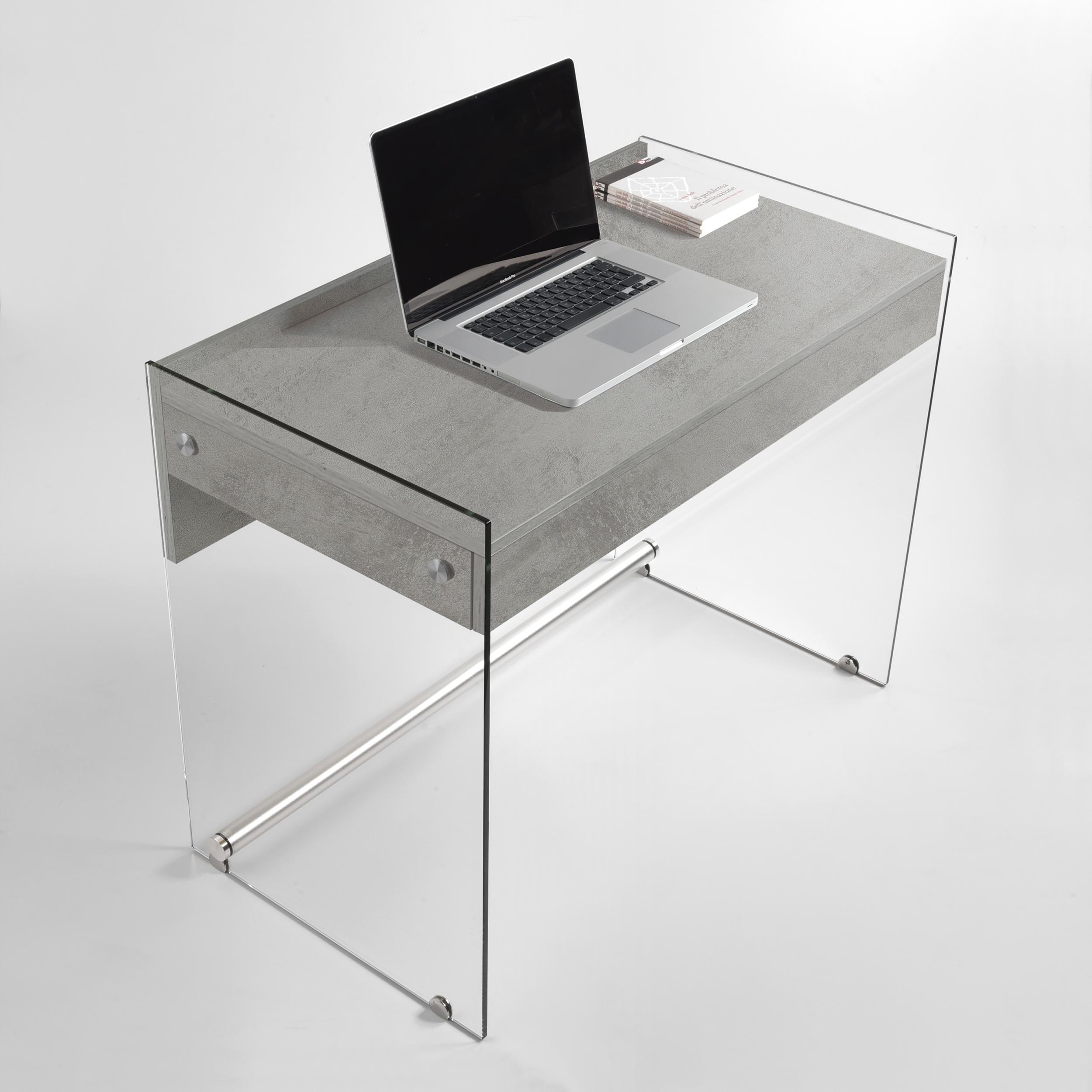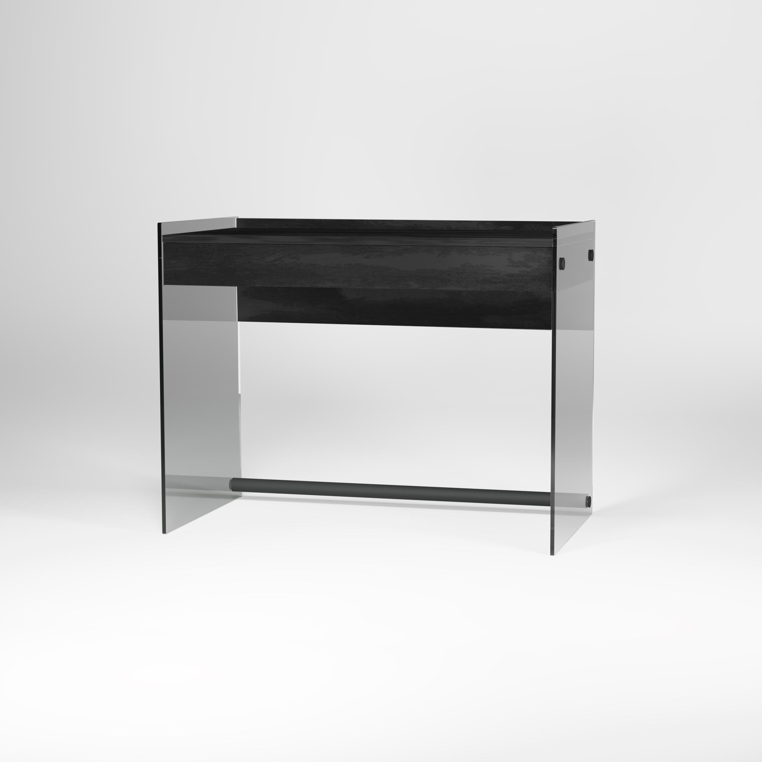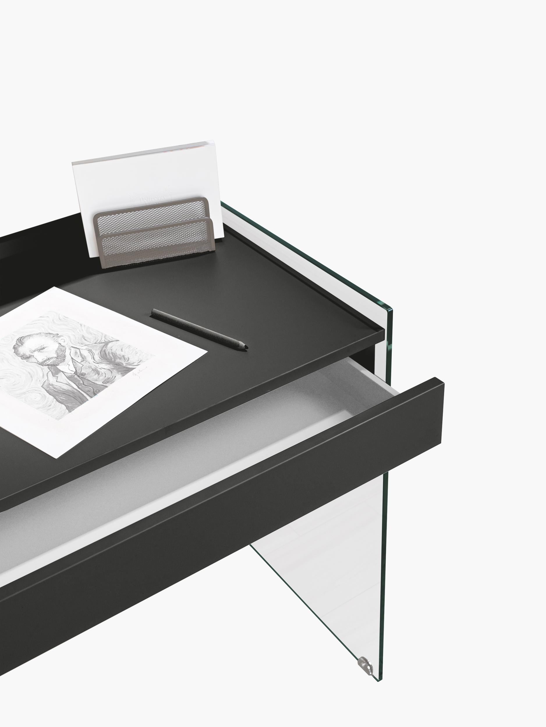 Bureau de style contemporain. Sa structure se compose de deux élégants panneaux latéraux en verre trempé clair ou fumé gris de 10 mm d'épaisseur. Les étagères et le tiroir spacieux sont en stratifié écologique de 18 mm d'épaisseur. Les fixations sont en aluminium satiné (avec verre clair) ou en aluminium anodisé noir mat (avec verre fumé gris).