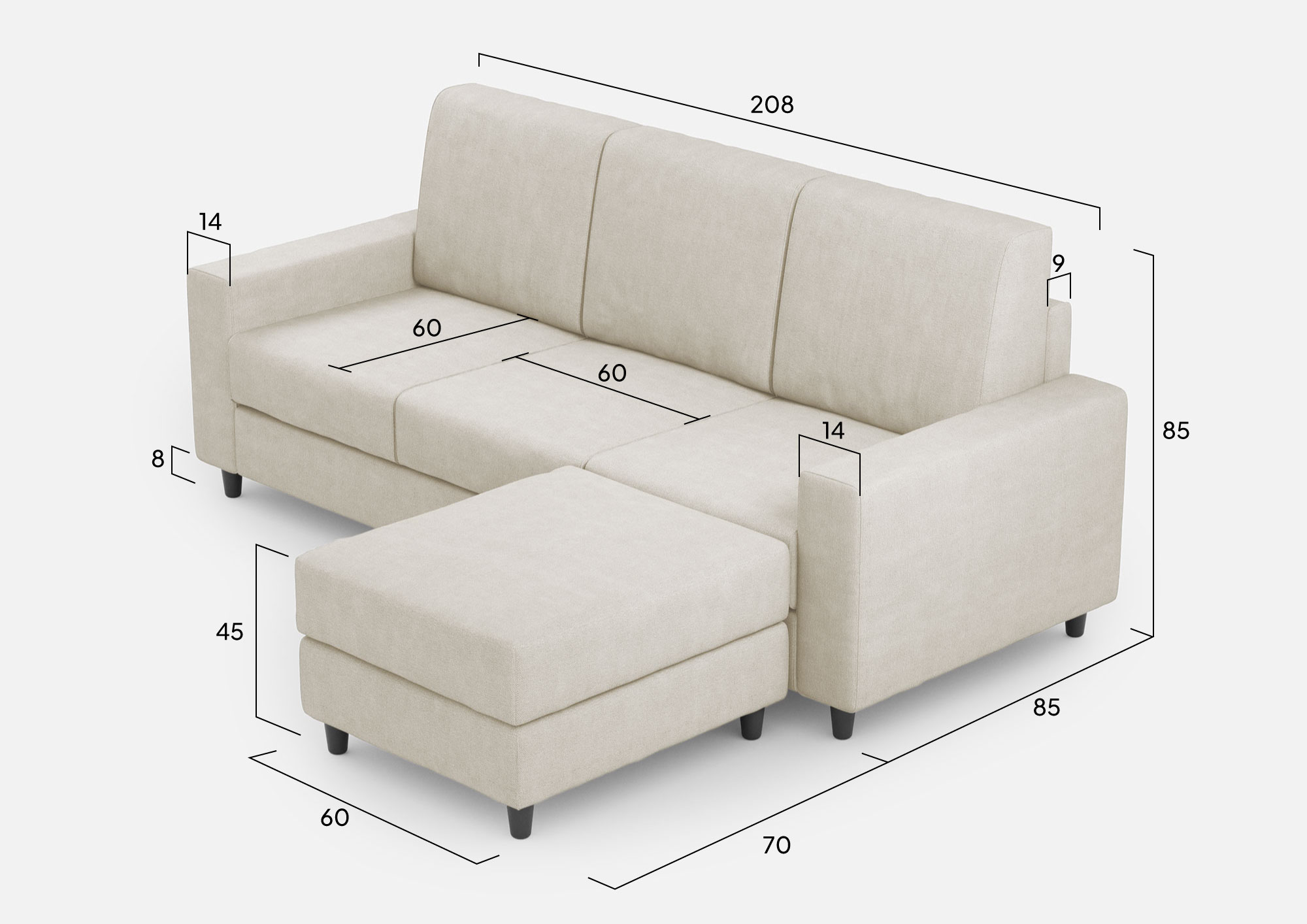 Ajoutez une touche de style et de confort à votre salon avec notre canapé 3 places Sakar, complété d'un pouf pratique. Achetez notre canapé élégant et confortable en ligne pour créer un environnement accueillant, sophistiqué et fonctionnel dans votre maison. L'assise du canapé Sakar garantit un confort exceptionnel grâce à sa répartition uniforme du poids sur le coussin, assurée par le contact avec le dossier. Vous pourrez vous détendre confortablement et profiter d'agréables moments de repos sans aucune gêne. Fabriqué avec des matériaux de haute qualité, notamment une structure robuste et un rembourrage en mousse haute densité, ce canapé offre une durabilité et un confort à long terme. Vous pourrez profiter de votre canapé Sakar pendant des années sans compromettre son aspect élégant et ses performances confortables. Le design élégant et moderne du canapé Sakar s'adapte facilement à n'importe quel environnement et style d'ameublement. Les lignes épurées et le look minimaliste ajoutent une touche de sophistication à votre salon. De plus, les couleurs des revêtements sont polyvalentes et faciles à assortir avec les autres meubles présents. Le pouf, avec le même revêtement que le canapé, peut être positionné librement pour servir de repose-pieds ou de siège supplémentaire lorsque vous recevez des invités, offrant ainsi une plus grande flexibilité et hospitalité. Il est équipé de fixations simples et invisibles qui permettent de le verrouiller sur l'assise souhaitée, garantissant ainsi sa stabilité. Alternativement, vous pouvez le déplacer rapidement vers différentes positions, en fonction de vos besoins et de l'espace disponible. Le canapé 3 places Sakar avec pouf est le choix idéal pour ceux qui recherchent un maximum de confort, de style et de praticité dans leur maison. En achetant notre canapé Sakar, vous pouvez créer un environnement accueillant pour vous, votre famille et vos amis.