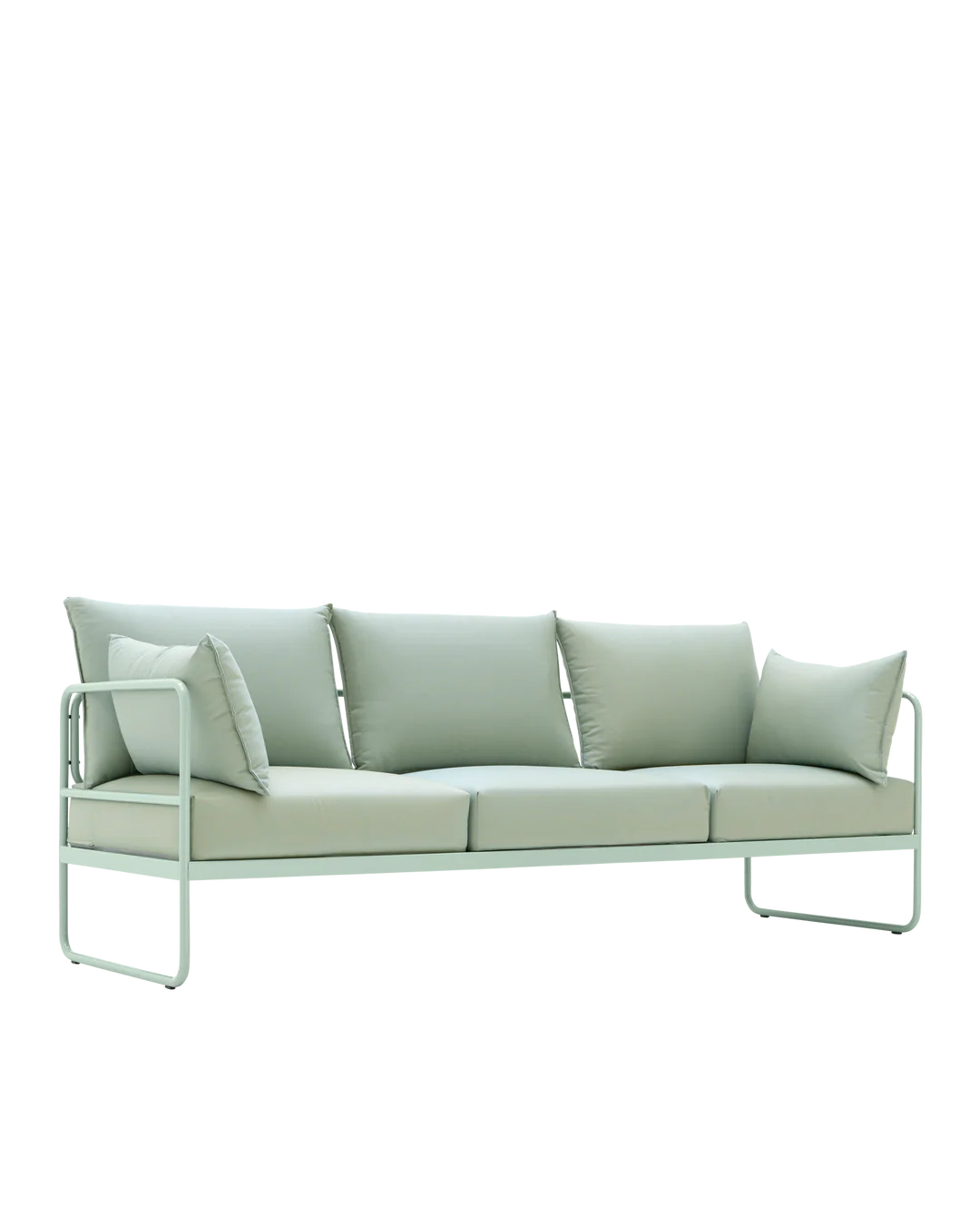 Canapé d'extérieur trois places Easy de Connubia. Avec une structure en tige métallique peinte de différentes couleurs. Equipé de coussins larges et confortables rembourrés de mousse polyuréthane et protégés par des housses en PVC imperméables et recouverts de tissu Sunbrella aux caractéristiques Outdoor : déperlant, protection UV et résistance à la décoloration, anti-moisissure et anti-taches.