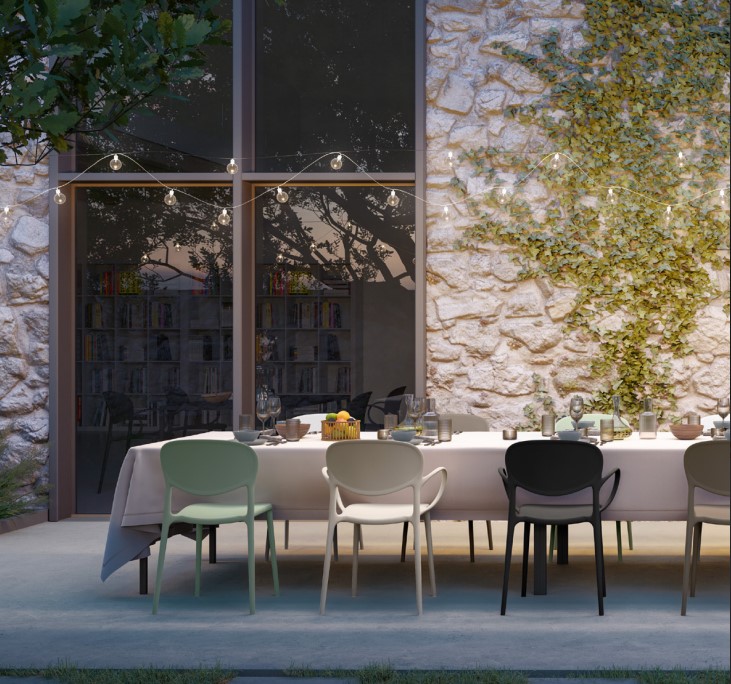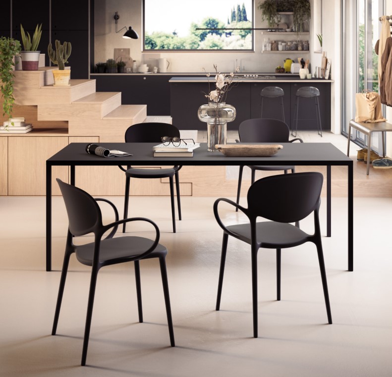 Chaise Abby de Connubia en polypropylène disponible en différentes couleurs, réalisée avec la technologie airmoduling et avec pieds interchangeables en PE haute résistance. La chaise Abby est disponible avec et sans accoudoirs.