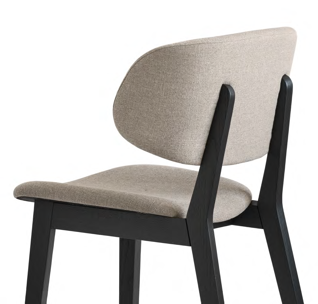 Chaise CLAIRE, structure en bois massif et assise rembourrée. Dossier large.