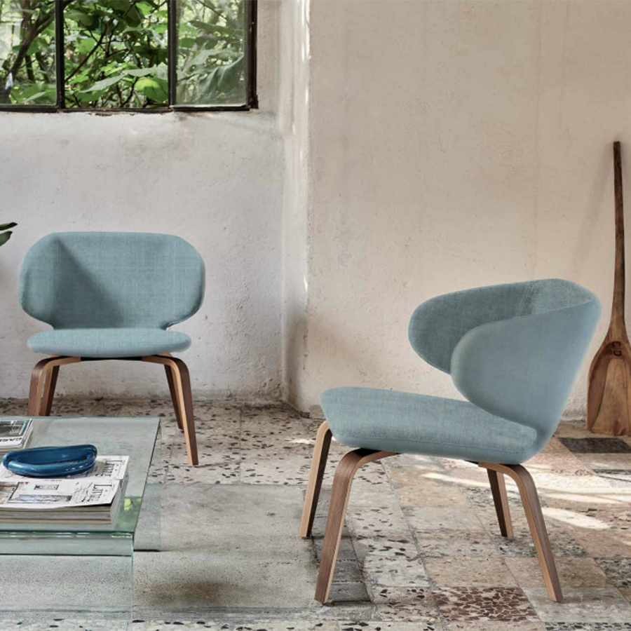 Chaise d'attente Wrap avec base en bois à quatre pieds.