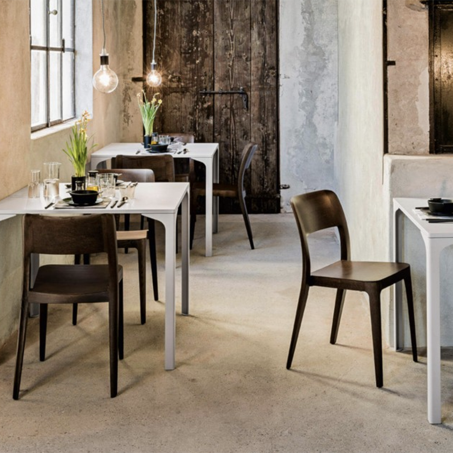 La chaise Nenè avec une base en bois à quatre pieds est empilable jusqu'à huit unités.