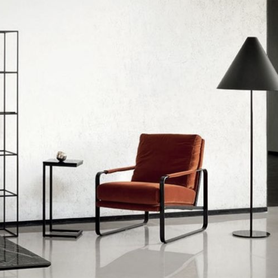 Clarissa est un fauteuil caractérisé par un design moderne, élégant et linéaire. La structure est entièrement en acier laqué. L'assise est composée de deux grands coussins, rembourrés et recouverts d'éco-cuir, de cuir ou de tissu