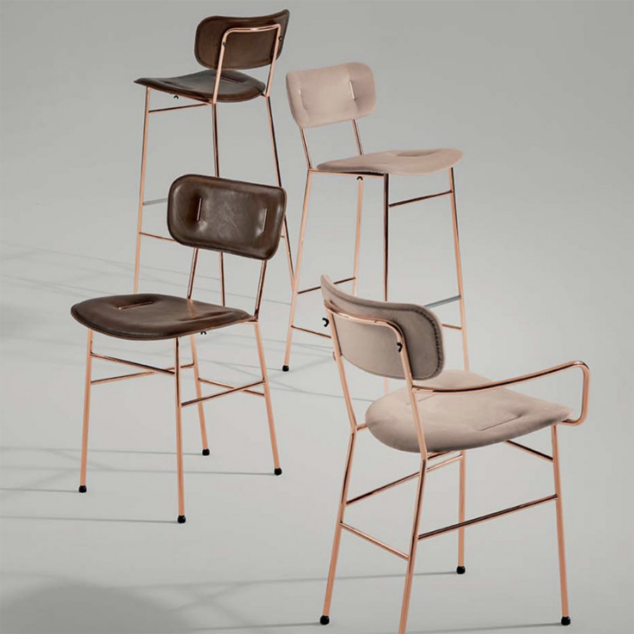 La collection Piuma comprend les versions chaise, fauteuil et tabouret avec assise et dossier en bois, cuir, cuir, tissu ou simili cuir