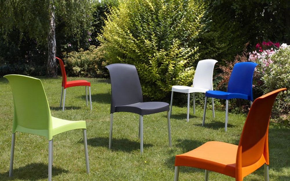 Assise et dossier en technopolymère. Pieds en aluminium anodisé de 25 mm de diamètre. Disponible en plusieurs coloris. Empilable. Pour usage intérieur/extérieur.
