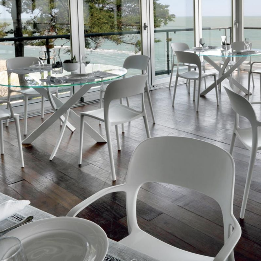 Gipsy en polypropylène se caractérise par sa légèreté, sa bonne résistance et ses couleurs vives et est idéal aussi bien à l'intérieur qu'à l'extérieur de la maison et est disponible dans la version avec et sans accoudoirs. Il est souligné comment la caractéristique d'empilabilité de la chaise Gipsy de Bontempi permet la meilleure optimisation des espaces.
