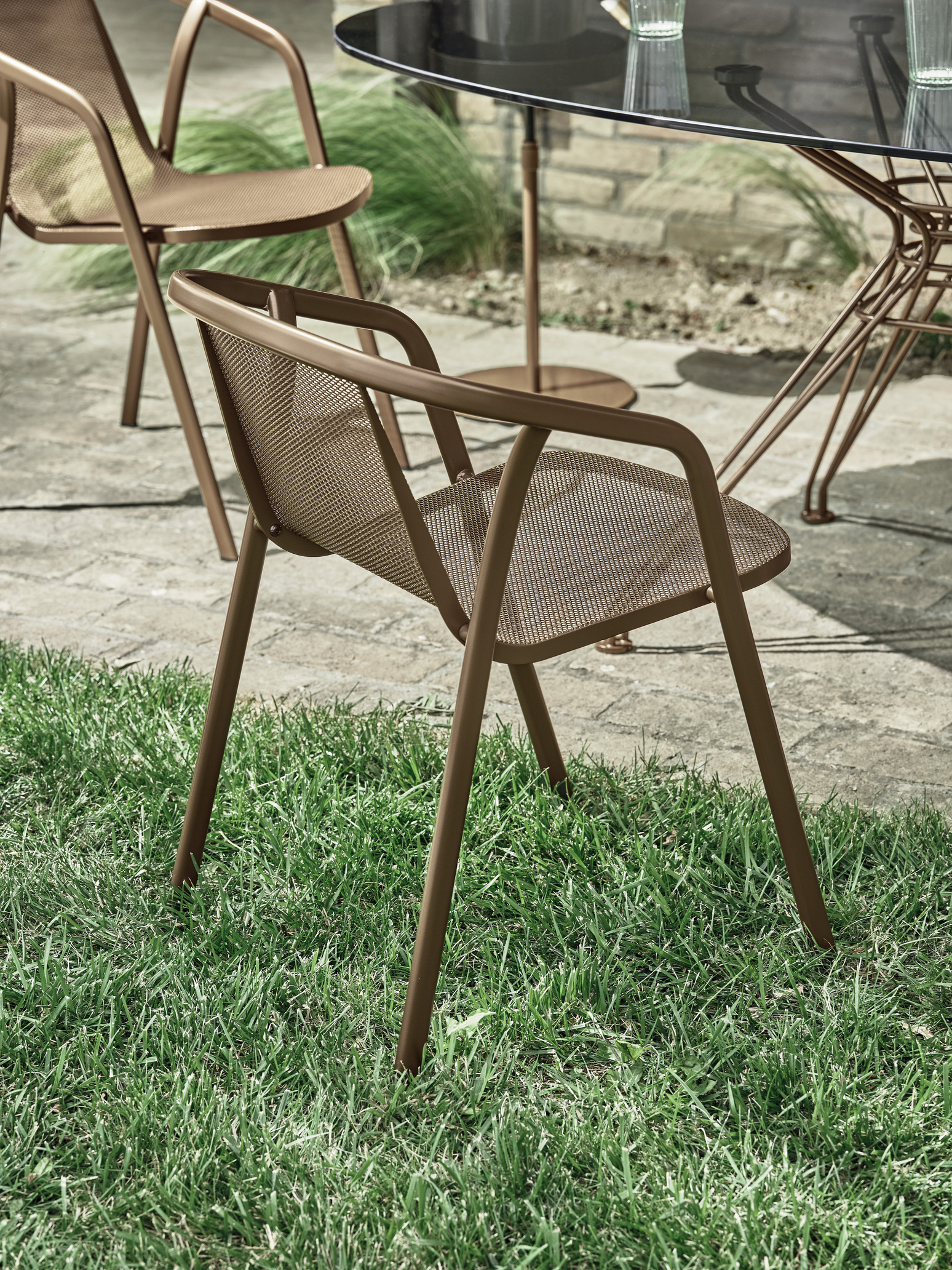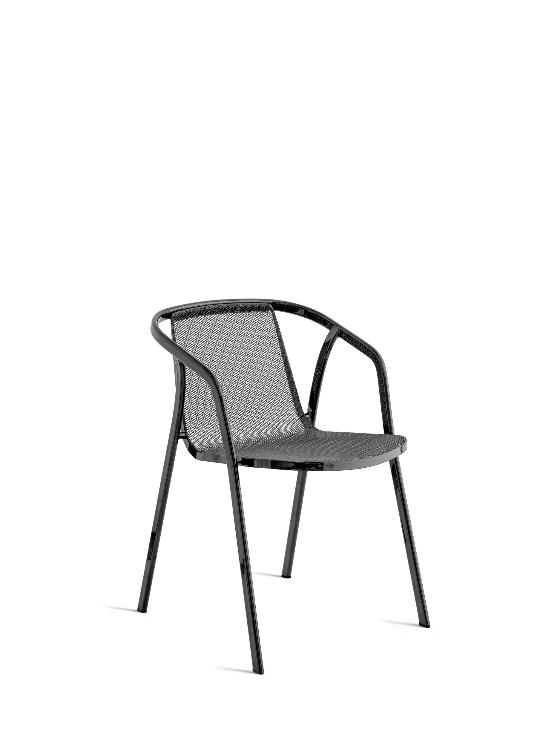 Chaise Ines de Bontempi avec structure et assise entièrement en acier laqué. Disponible en deux versions : une pour usage interne et une pour usage externe. Avec une ligne simple et une assise et un dossier en résille, ce siège enveloppant peut être rendu encore plus confortable grâce au pratique coussin en option disponible dans tous les tissus d'intérieur ou en tissu d'extérieur.