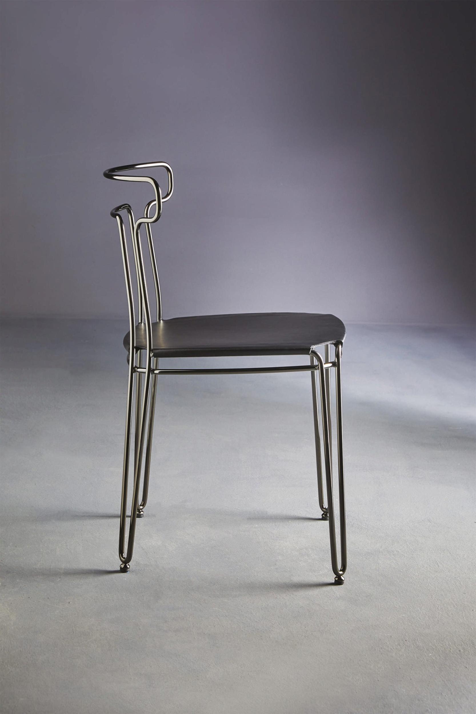 Chaise avec structure en tige d'acier et assise recouverte de cuir. Chaleureux et persuasif, les lignes harmonieuses rappellent les sièges d'autrefois, la matière utilisée est froide. Un équilibre singulier qui fait de Jackie une chaise unique et inimitable.