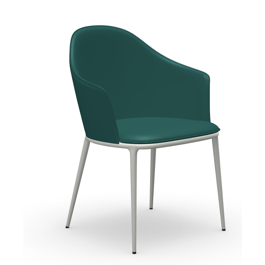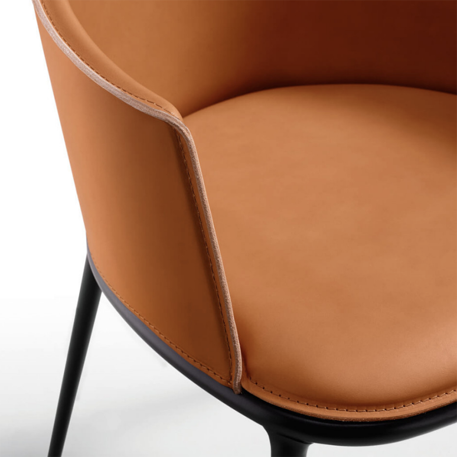 Fauteuil Lea avec pieds en acier peint. Assise et dossier rembourrés en cuir ou cuir toscan.