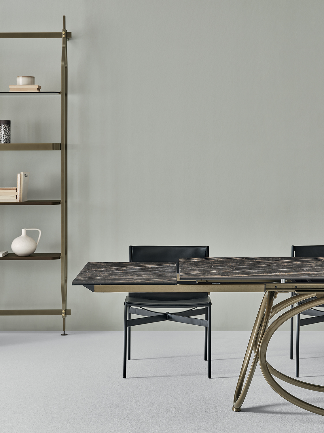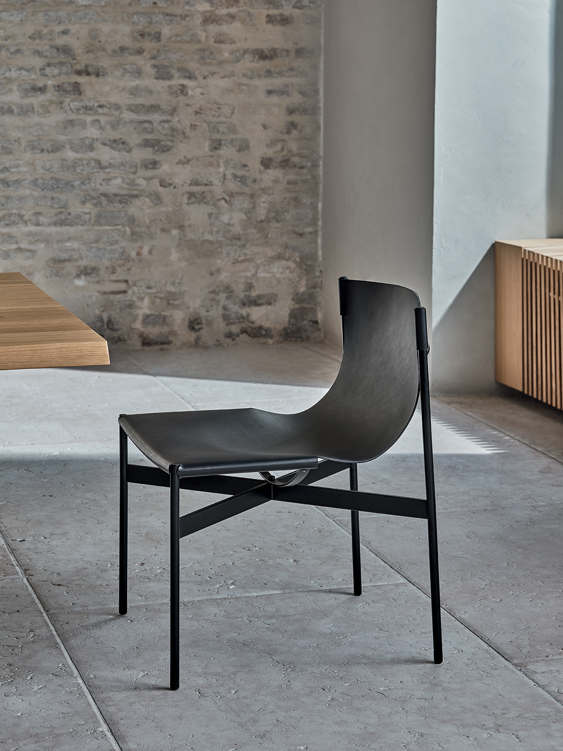 Chaise avec ou sans accoudoirs, structure en acier laqué, assise rembourrée recouverte de cuir pleine fleur sans couture. Des lignes douces parcourent la chaise, mettant en valeur toute la personnalité. Disponible avec ou sans accoudoirs, cette chaise se prête à être portée dans une grande variété de finitions qui en font un objet d'expression maximale.