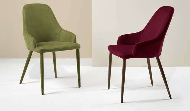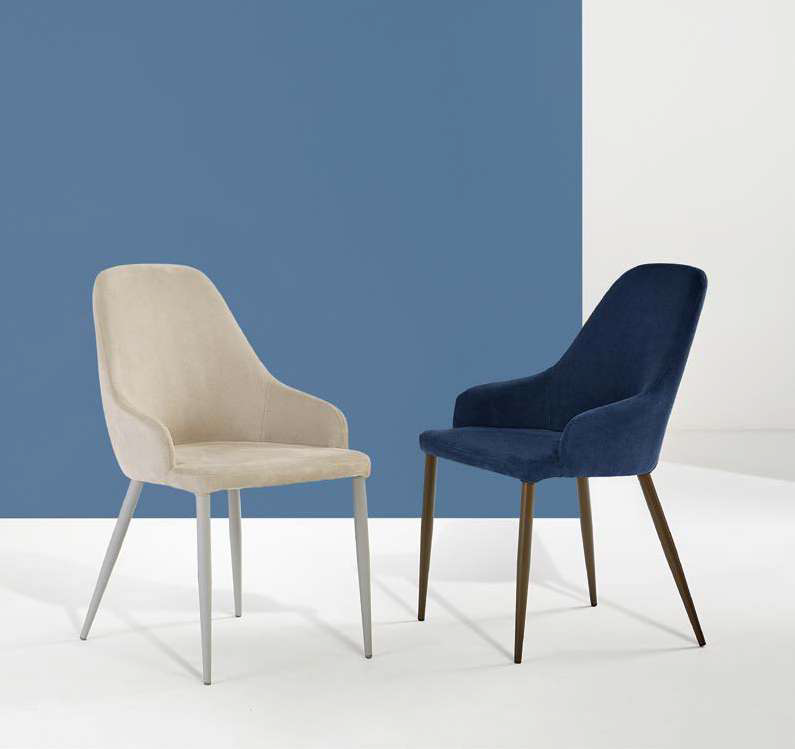 Chaise Matilda d'Ingenia disponible dans la version avec structure en acier laqué, assise et dossier rembourrés dans de nombreuses finitions ou avec structure en acier et entièrement rembourrée dans de nombreuses finitions.