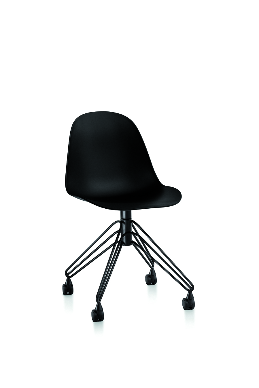 Chaise Mood de Bontempi avec et sans accoudoirs, avec structure pivotante en acier laqué et monocoque en polypropylène. La large gamme de couleurs de son coussin moelleux le rend polyvalent et très personnel. Également disponible en version avec roulettes.
