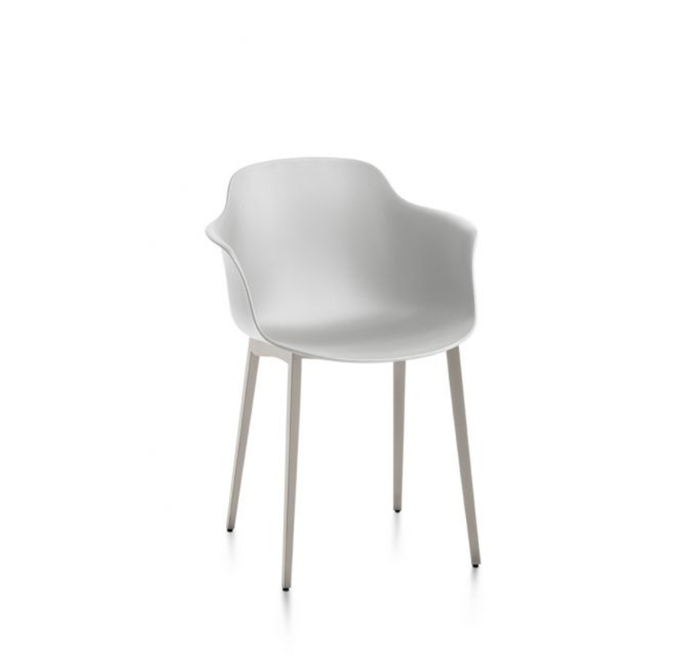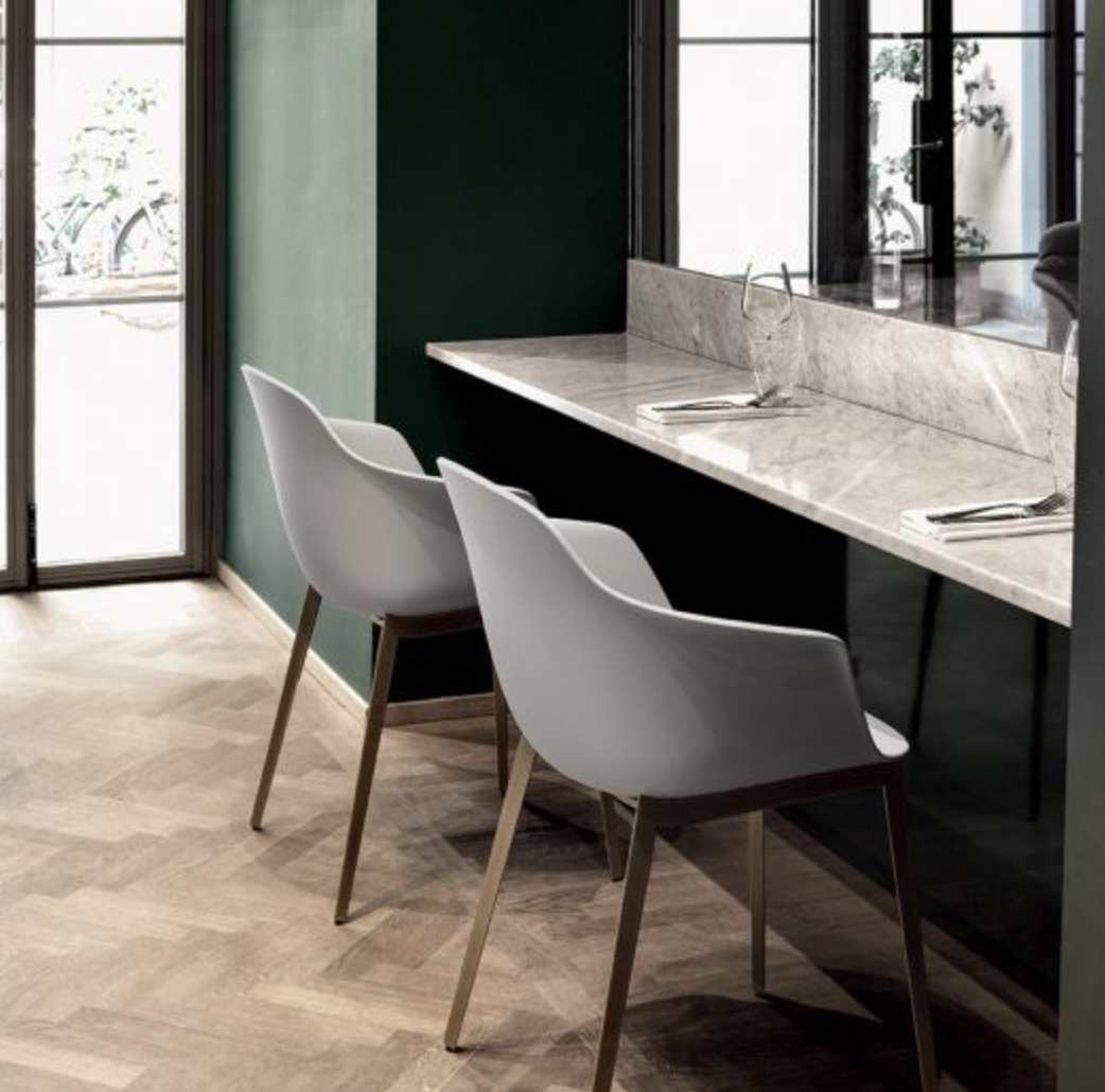 Chaise Mood de Bontempi disponible sans accoudoirs ou avec accoudoirs, avec une structure en acier laqué ou en bois massif et une monocoque en polypropylène. La large gamme de couleurs de son revêtement doux le rend polyvalent et très personnel.