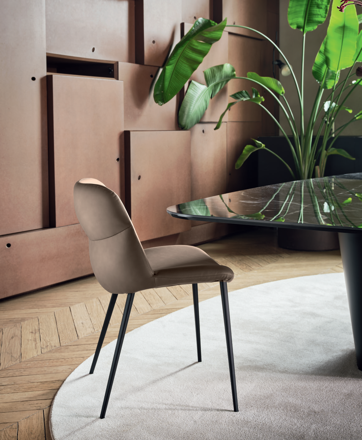 La chaise Onda tire son nom de la forme distinctive de son assise, dont les courbes sinueuses évoquent le mouvement de la mer. Ses proportions douces sont équilibrées par les pieds métalliques élancés.