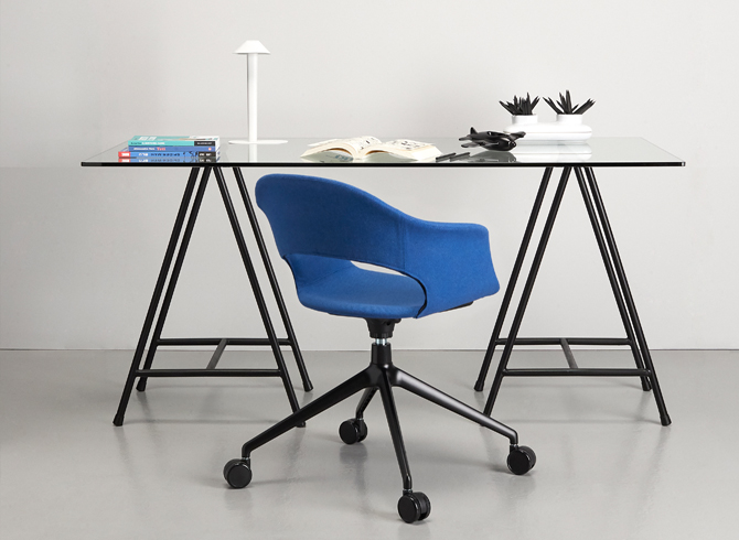 Particulièrement adaptée aux solutions de télétravail, la version rembourrée avec structure à quatre branches et roulettes enveloppe d'élégance et de confort aussi bien les personnes en réunion que celles qui restent assises toute la journée. La large gamme de couleurs vous permet de personnaliser l'espace selon votre style.