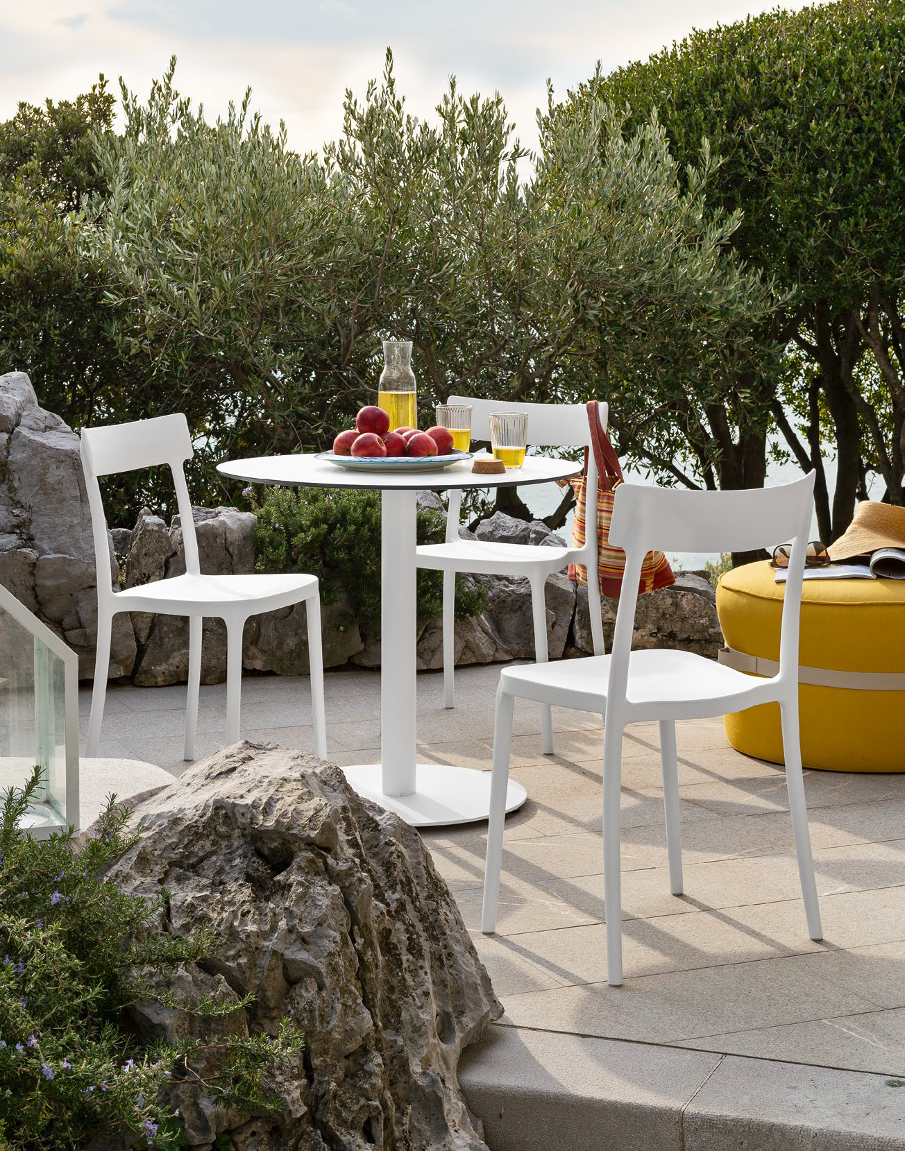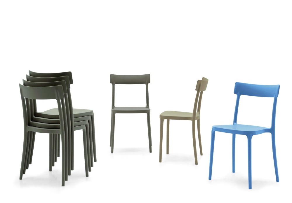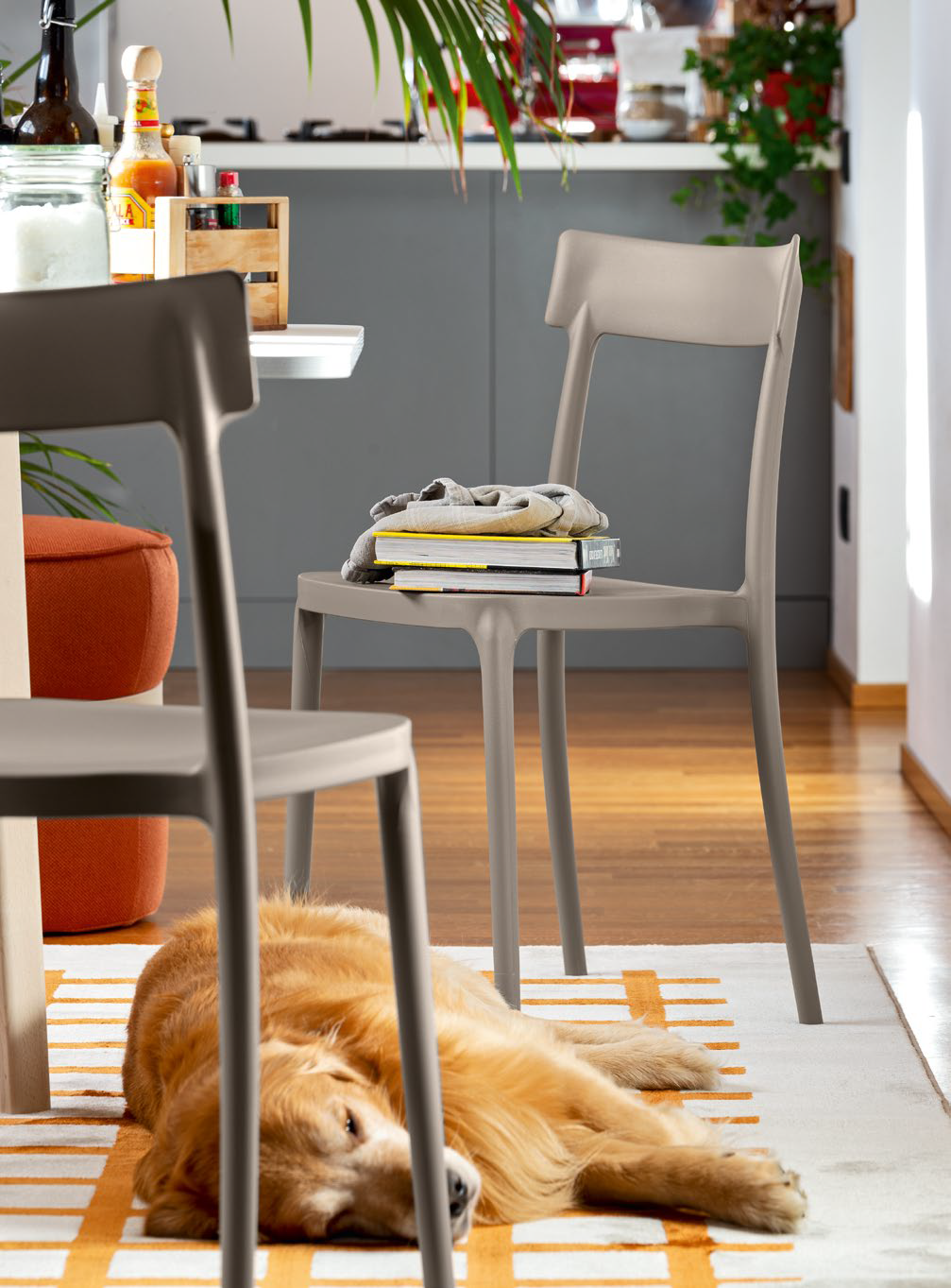 Chaise Argo CB1523 de Connubia. Fabriqué entièrement en polypropylène, empilable jusqu'à un maximum de quatre, il convient également à une utilisation en extérieur. Le matériau plastique - le polypropylène - et la technique de fabrication - Airmoulding ou moulage par injection - utilisés ont permis de créer une chaise monocoque avec une surface légèrement gaufrée - rugueuse au toucher - légère mais robuste et également adaptée à une utilisation en extérieur. Les pieds de support sont interchangeables et très résistants, Adaptés à un environnement moderne : maison, terrasse ou bar.