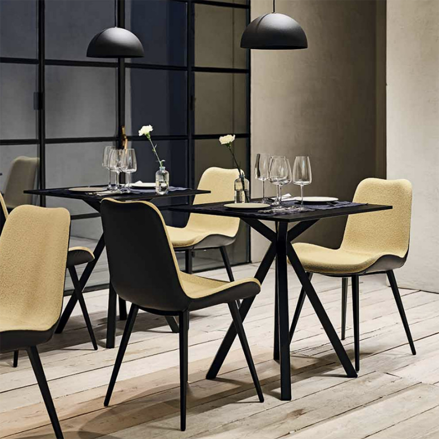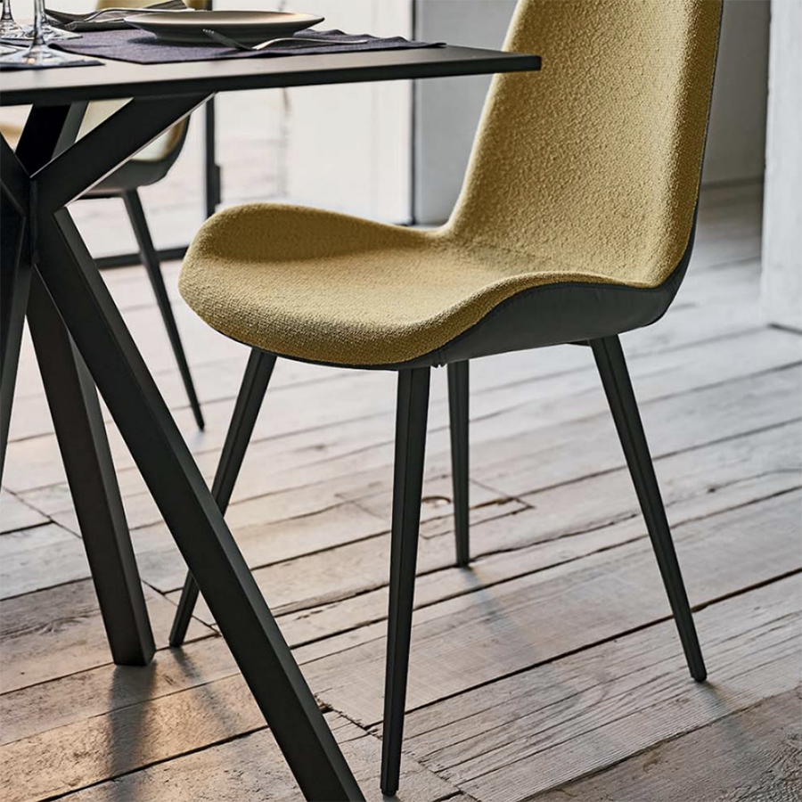 Chaise Cover S M_M avec piètement en acier à quatre pieds ou à luge, avec coque rembourrée.