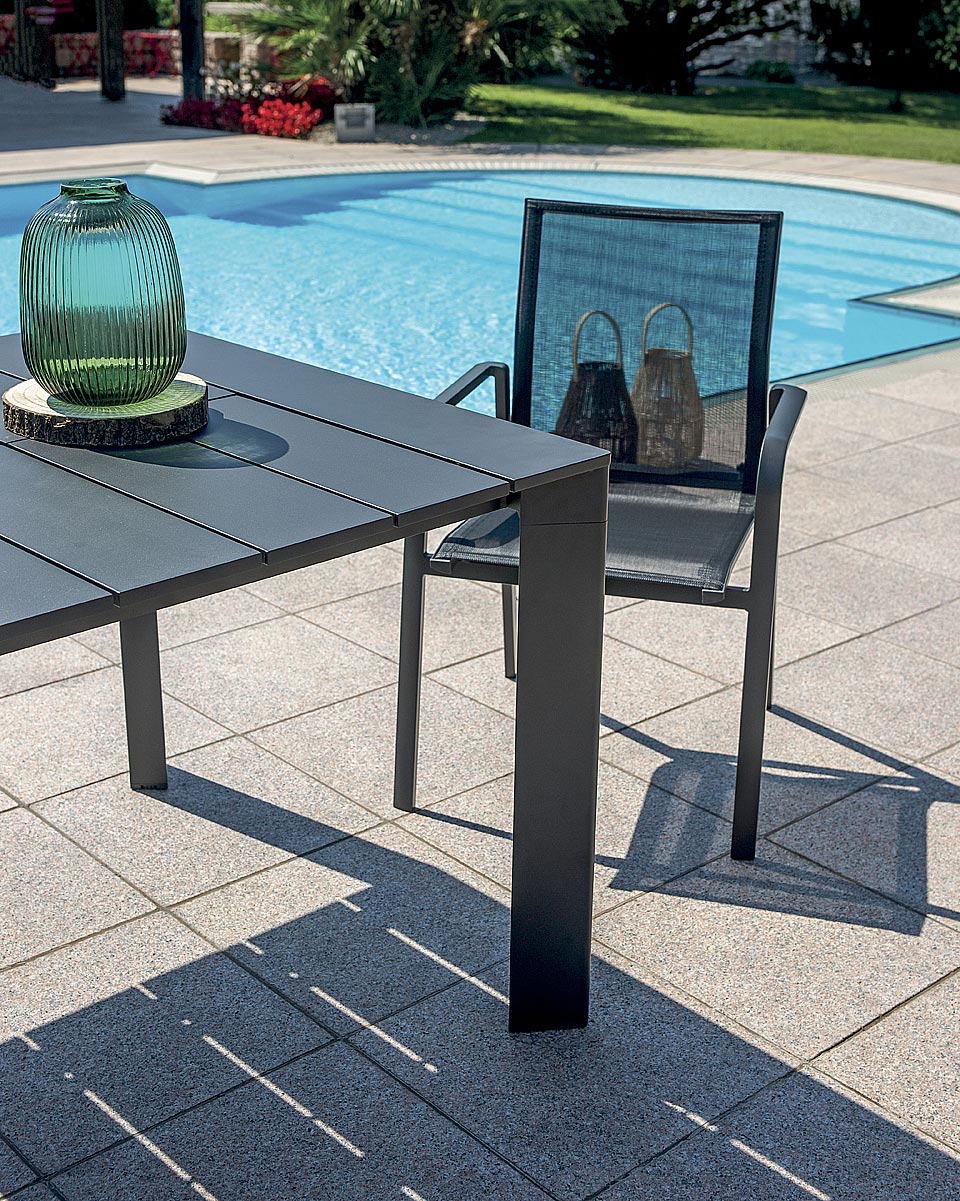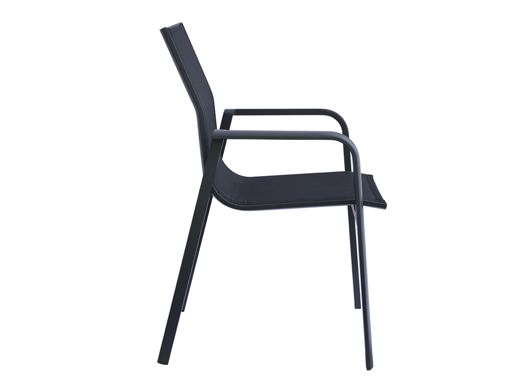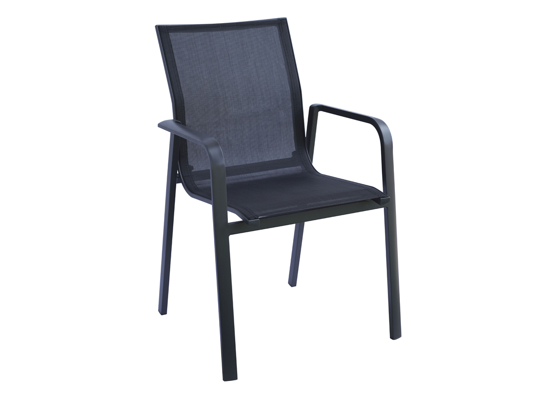 Sa structure en aluminium anthracite allie robustesse et légèreté, rendant la chaise facile à déplacer et idéale pour un usage quotidien. L'assise et le dossier en textilène noir offrent une surface respirante et confortable, même par temps chaud, tout en étant résistants et faciles d'entretien.