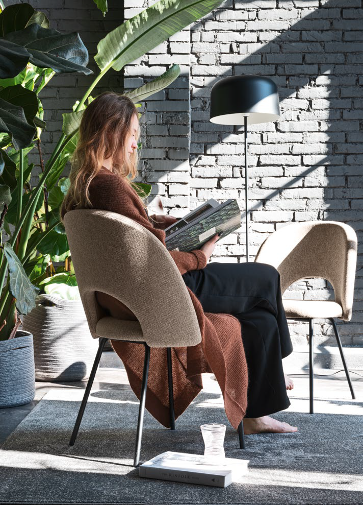 Chaise Tuka Mid Hole CB2306 de Connubia avec 4 pieds en tube métallique. Coque fixe rembourrée et tapissée avec dossier enveloppant, perforé et de hauteur moyenne et assise arrondie.