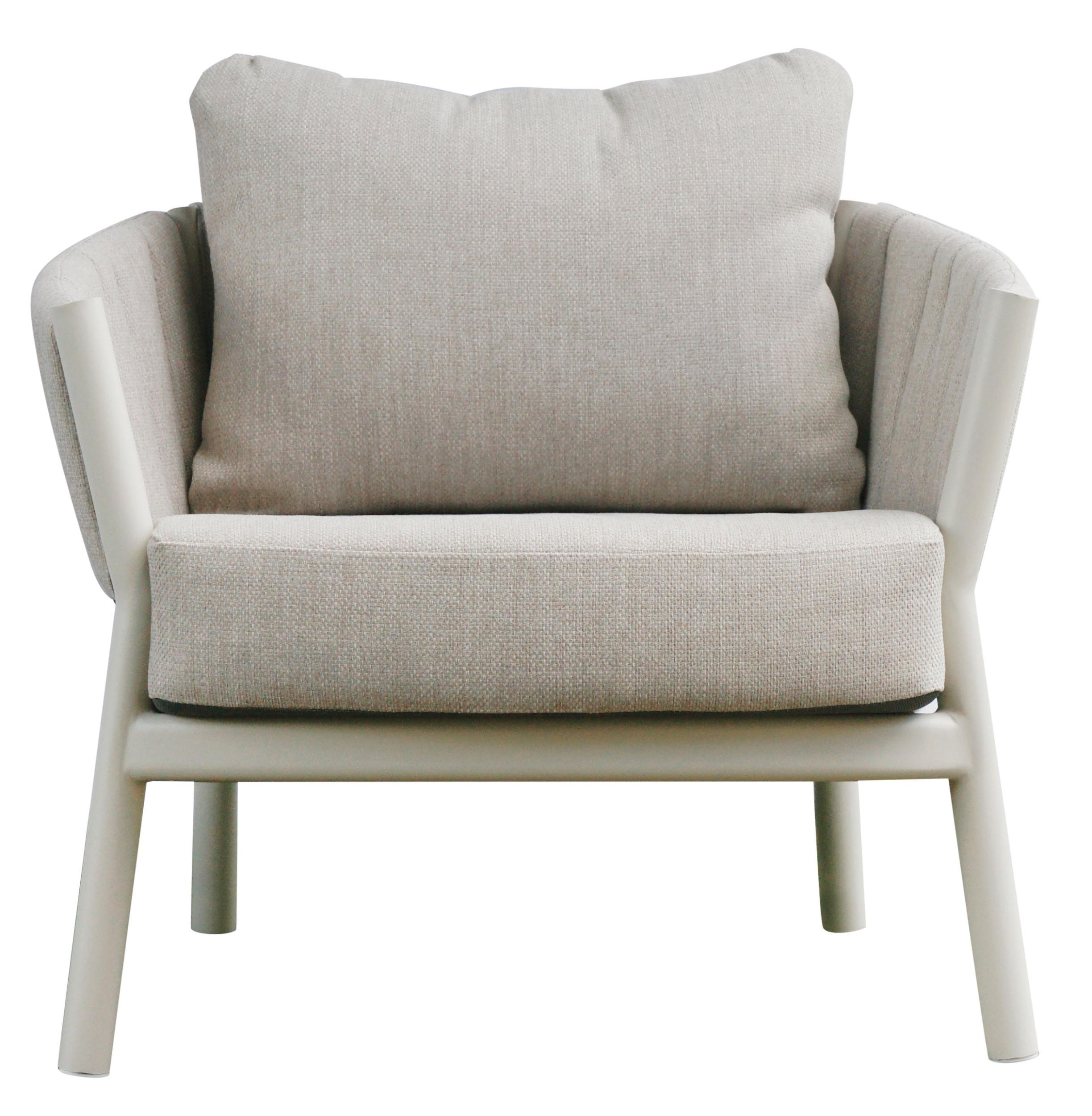 Structure en aluminium blanc, rembourrage gris, coussins amovibles gris.
