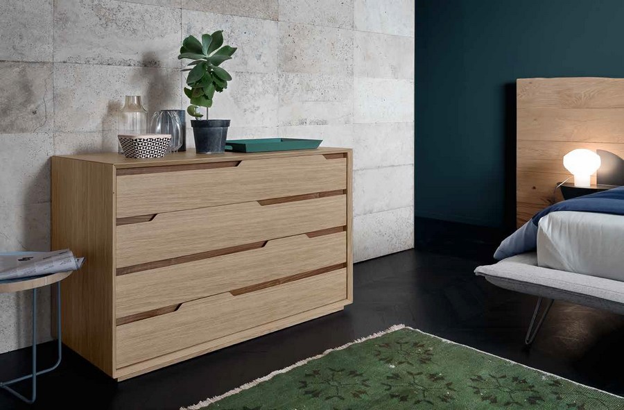 Commode rapide à quatre tiroirs en bois massif produite par Altacorte, un objet en bois massif aux lignes futuristes et au travail creux complexe pour obtenir les poignées, qui peuvent être du même matériau que l'élément ou contrastées avec des inserts en noyer ou en chêne.