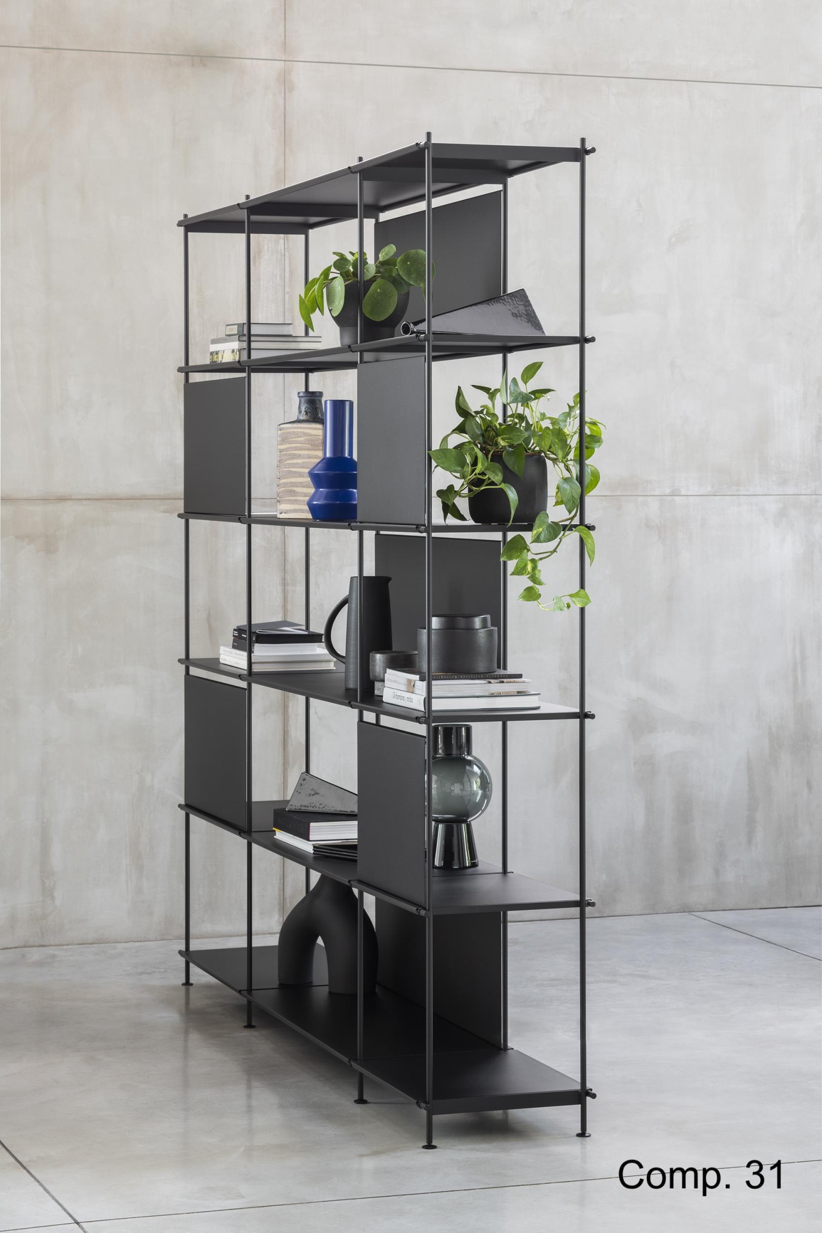 MUSA est la bibliothèque modulaire idéale pour les amateurs de design et de style minimaliste. Très polyvalente, elle peut être placée contre un mur ou au centre d'une pièce, servant ainsi de séparation. Sa structure modulaire est entièrement réalisée en acier, avec des montants latéraux en acier rond massif de 12 mm de diamètre et des panneaux arrière en tôle d'acier, tous deux revêtus d'une élégante finition sablée. Ce système permet de créer des compositions parfaitement adaptées à vos besoins en combinant des montants latéraux de quatre hauteurs différentes (202, 126, 88 et 50 cm) et des étagères disponibles en plusieurs dimensions : 43, 58 et 88 cm. Ces dernières sont également proposées dans divers matériaux : acier peint avec la même finition sablée que la structure, ou stratifié écologique de 12 mm avec des finitions satinées ou texturées. Les pieds en acier sont réglables en hauteur pour compenser les irrégularités du sol.