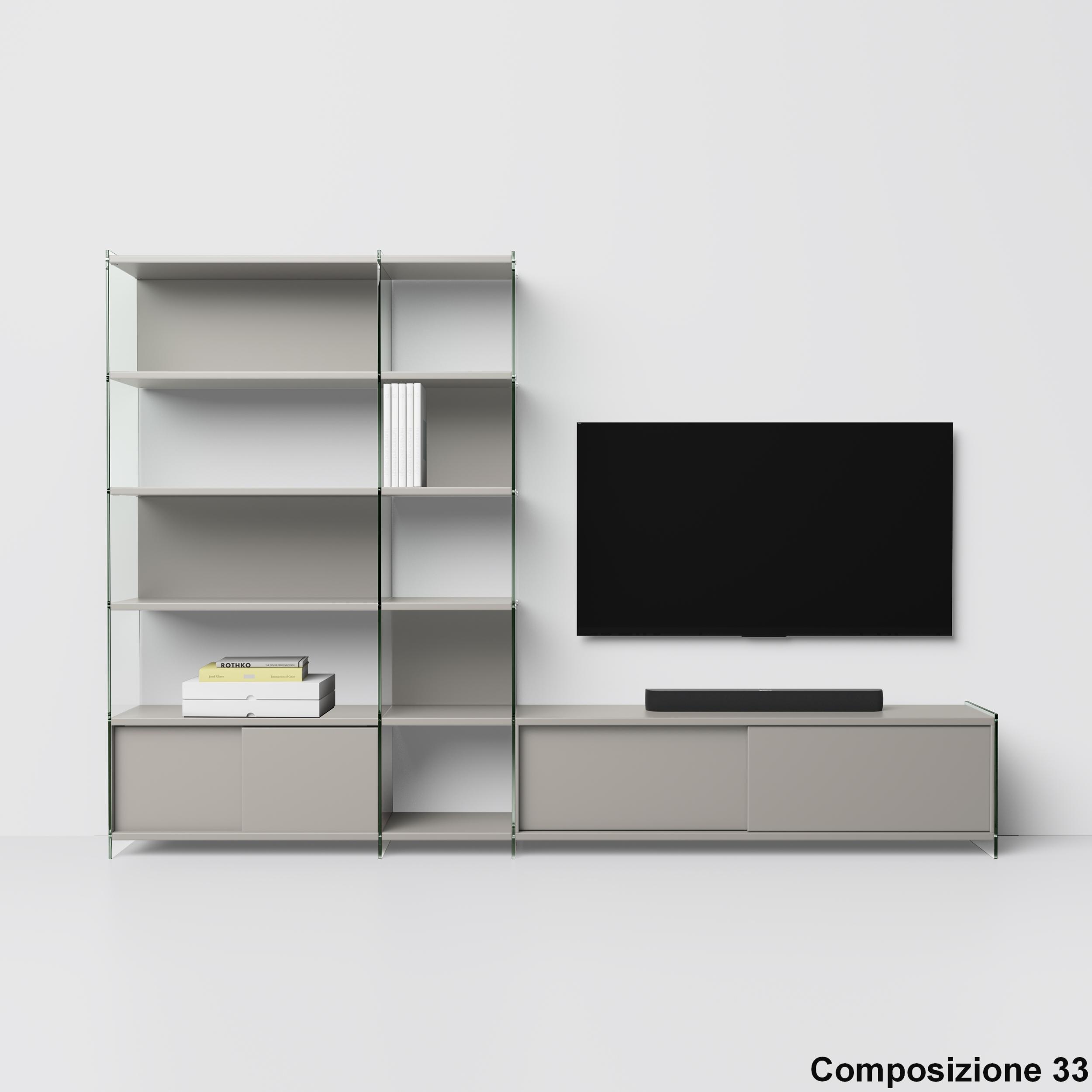Byblos est une bibliothèque modulaire élégante et prestigieuse, composée de côtés en verre trempé clair ou fumé de 10 mm et d'étagères stratifiées de 25 mm, livrée avec des accessoires de montage en aluminium. Très polyvalente, elle peut être utilisée dans des compositions linéaires ou comme séparateur de pièce.