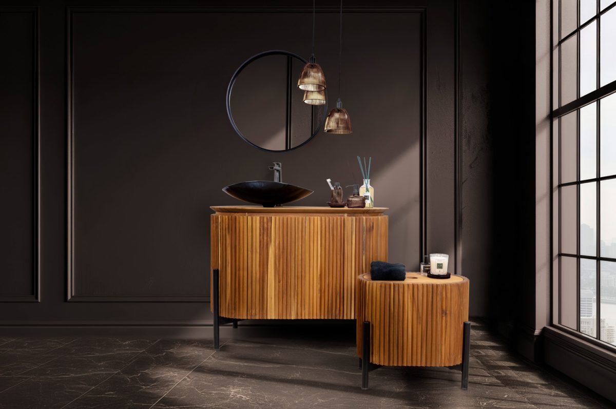 Deux portes pratiques donnent accès à de généreux espaces de rangement, les pieds en teck noir rationalisent le meuble et mettent en valeur le travail en « rouage » entièrement réalisé à la main, et le plateau à 45° ferme les géométries avec style. Teck naturel de classe A, formes et volumes raffinés sans poignées ni détails métalliques visibles pour un meuble caractérisé par le « bolidisme ». Uniquement du teck massif extra sec pour garantir des performances maximales. Dessus traité avec des cires naturelles créées pour résister, ou plutôt coexister avec l'eau !